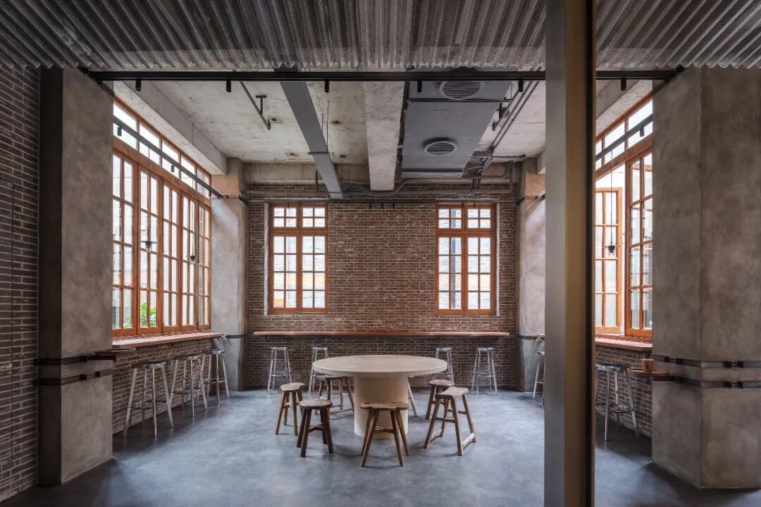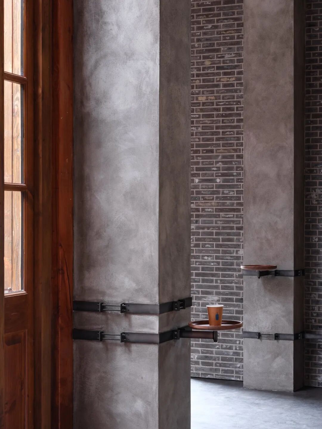 屋舍与建筑砖墙之间的带状空间,宛如一条室内里弄,将主空间与天井连接起来。在其间,放置三两长椅,几件小桌,倚窗而坐,仿佛回到了旧日里的石库门生活。