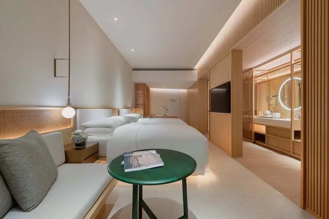 在设计上也与公区相辅相成,虽然没华丽的元素堆砌,但简洁的原木风却倍感舒心。