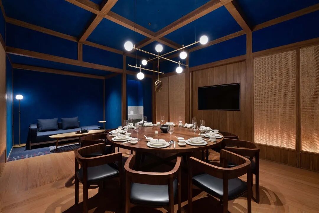 蔓园的设计也大有讲究,长达42米的巨型黄铜吊灯灵感来源于渔民的灯笼和渔网,给人以视觉与味觉交织融合的感官享受。