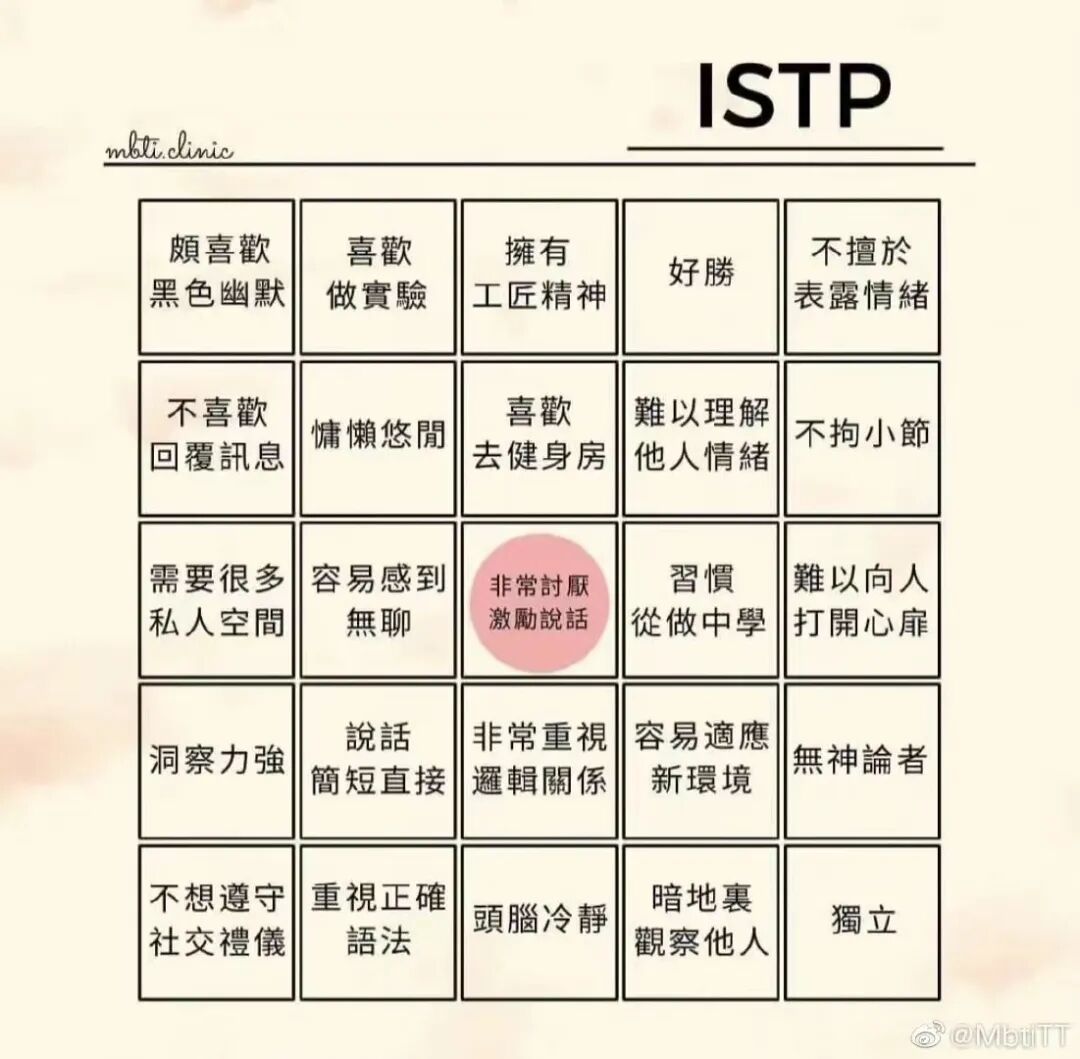ISTP是最顺应规则和天性、接近动物思维的人格,此人格一生放荡不羁爱自由,随性不喜欢计划,喜欢玩各类刺激拒绝平淡。