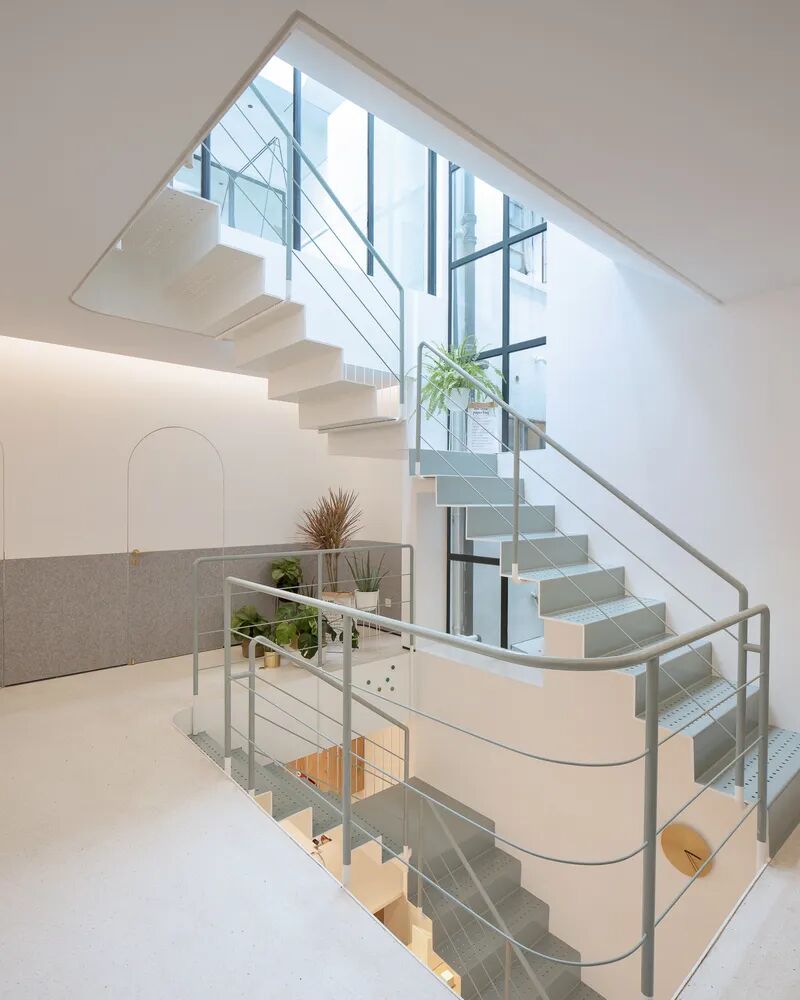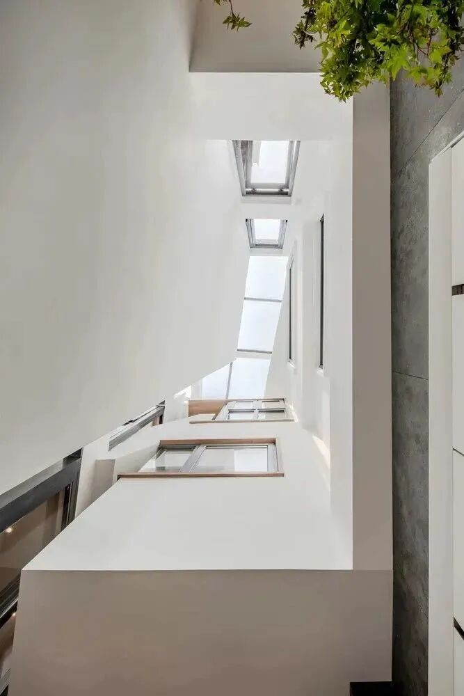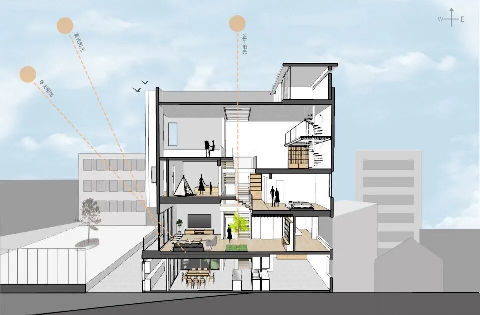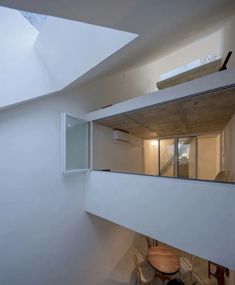 由于建筑的地形是长方形,有接近13米的进深。在建筑的中部区域设置为主要的垂直交通,并把除了楼梯和走道以外的所有位置做成挑空空间,结合屋顶对应的天窗,让光线可以从建筑的中部的照射到空间中,增加内部的光线。