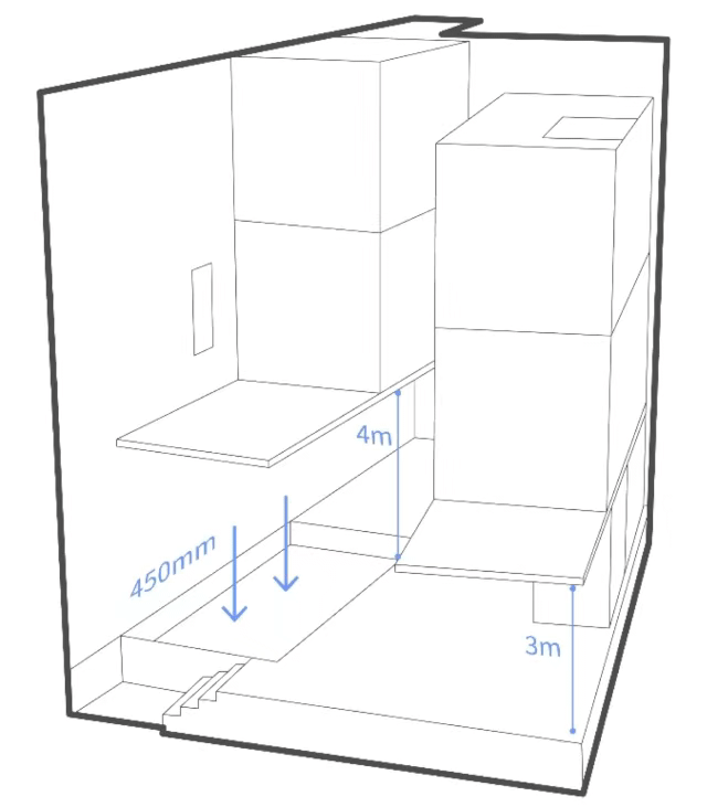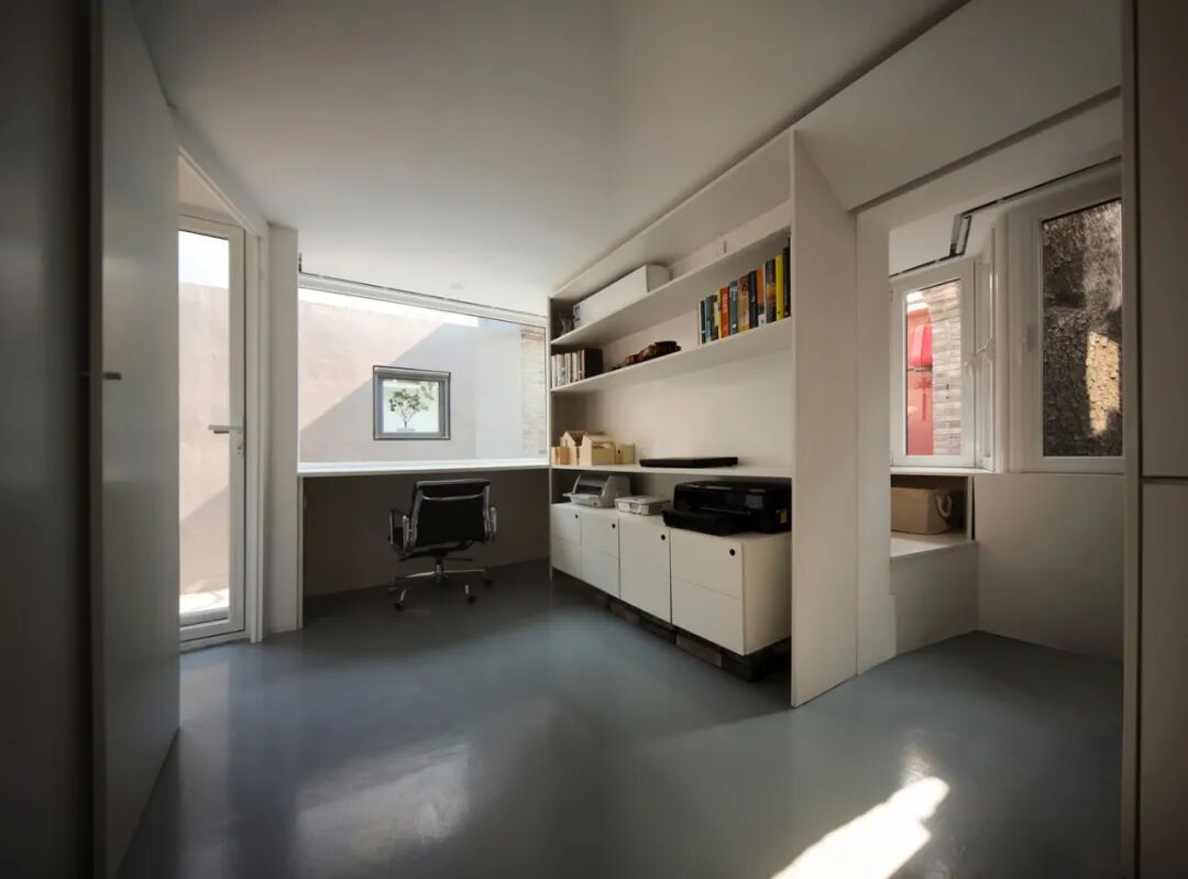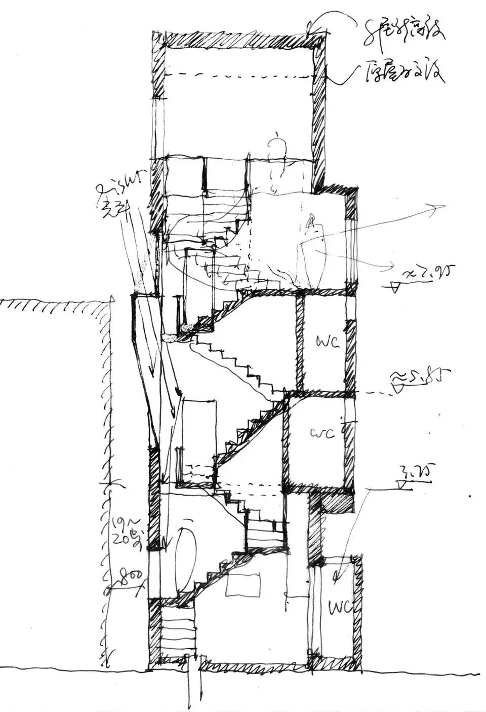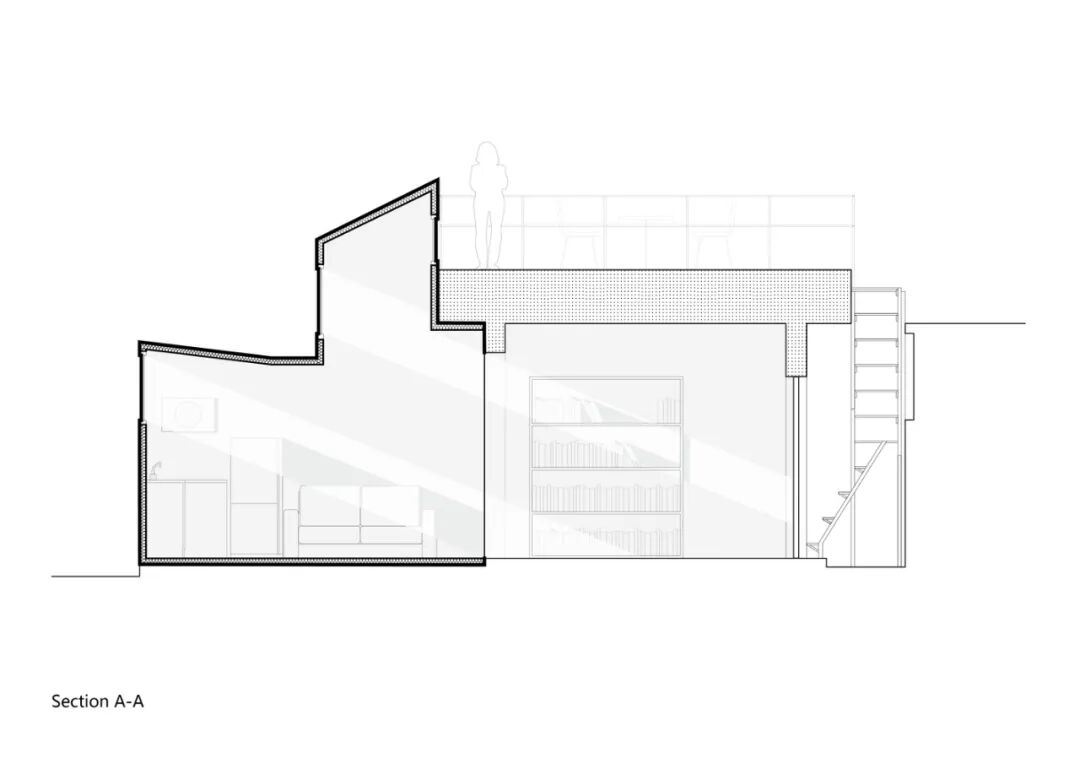 由于建筑的地形是长方形,有接近13米的进深。在建筑的中部区域设置为主要的垂直交通,并把除了楼梯和走道以外的所有位置做成挑空空间,结合屋顶对应的天窗,让光线可以从建筑的中部的照射到空间中,增加内部的光线。