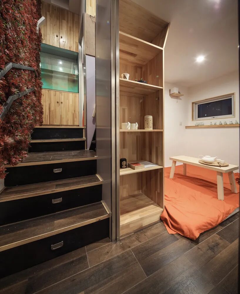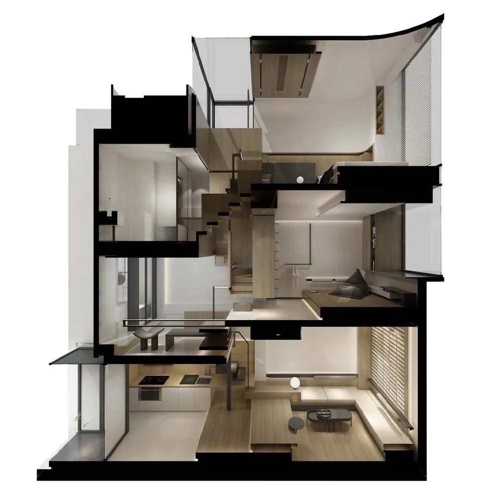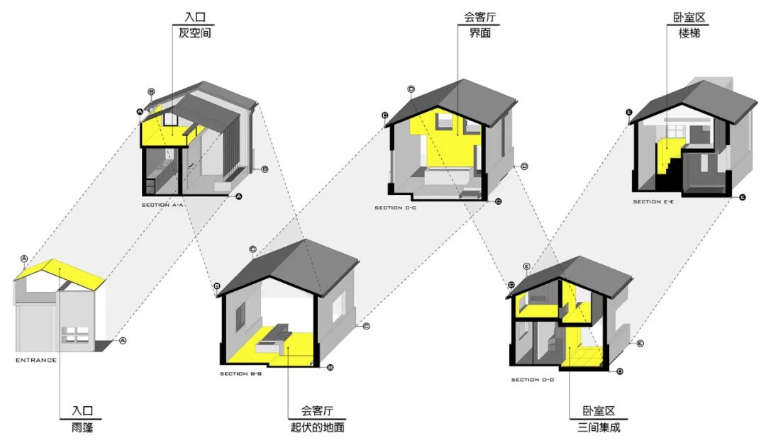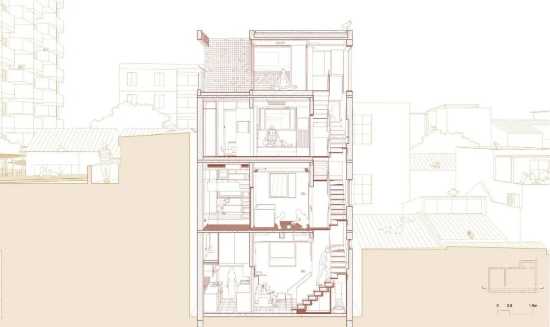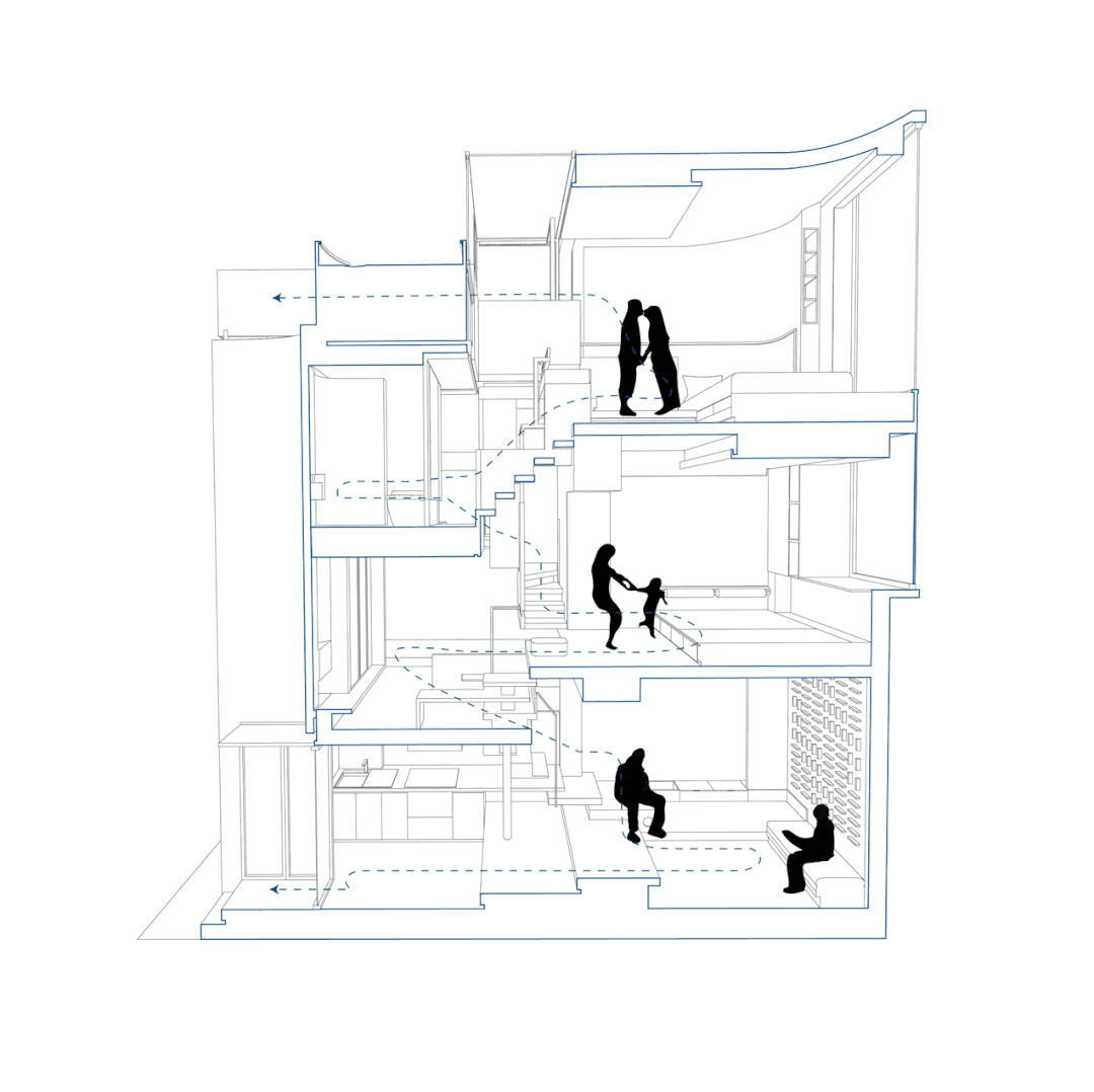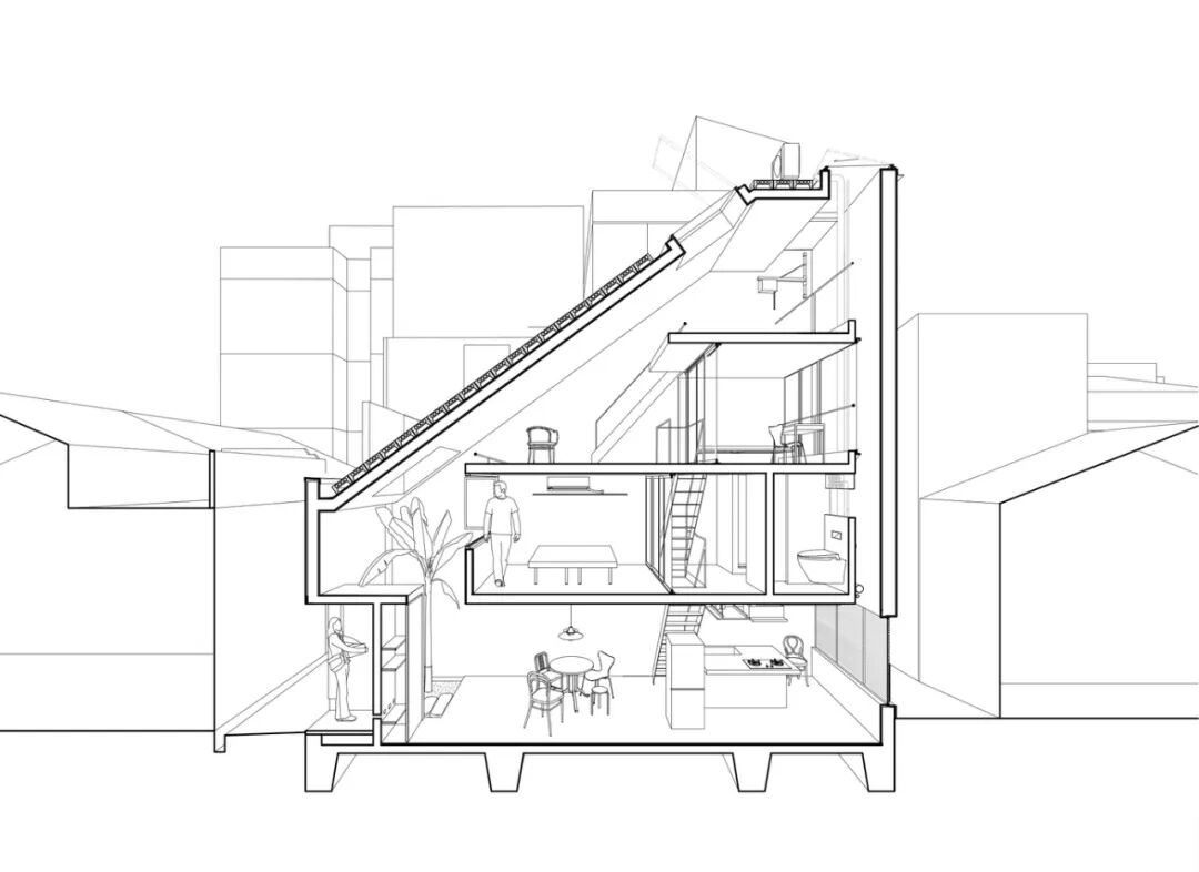 首先,利用L形的楼梯,设计师使空间和本土叙事风格在七个不同的层面上展开,在不同的节点上创造不同的场景,形成一轮轮的高潮。最终,建筑可以适应不同业主的生活,并提供了新的可能性。虽然建筑很小,但这个复杂的综合体可以保持更持久的生命周期
