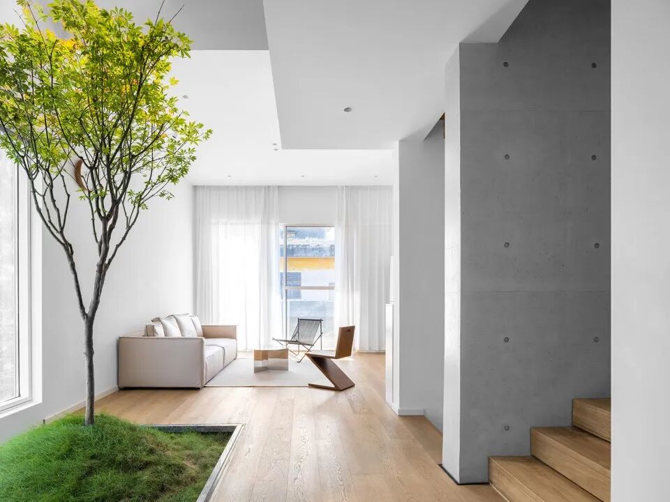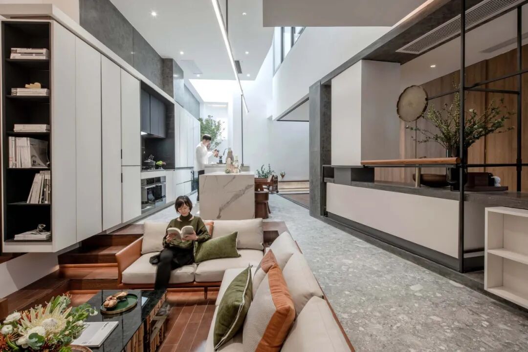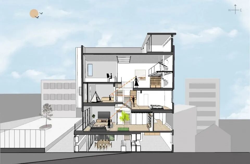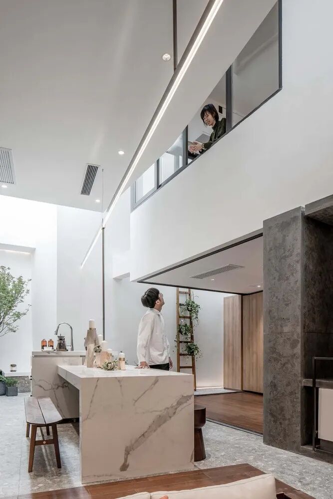 以中间的天井为核心,再将两边的建筑设计成错层结构,无论是光和空气都能更自由地融入到各个空间中,开放墙体,使各层空间更通透,视觉得以更好延伸。
