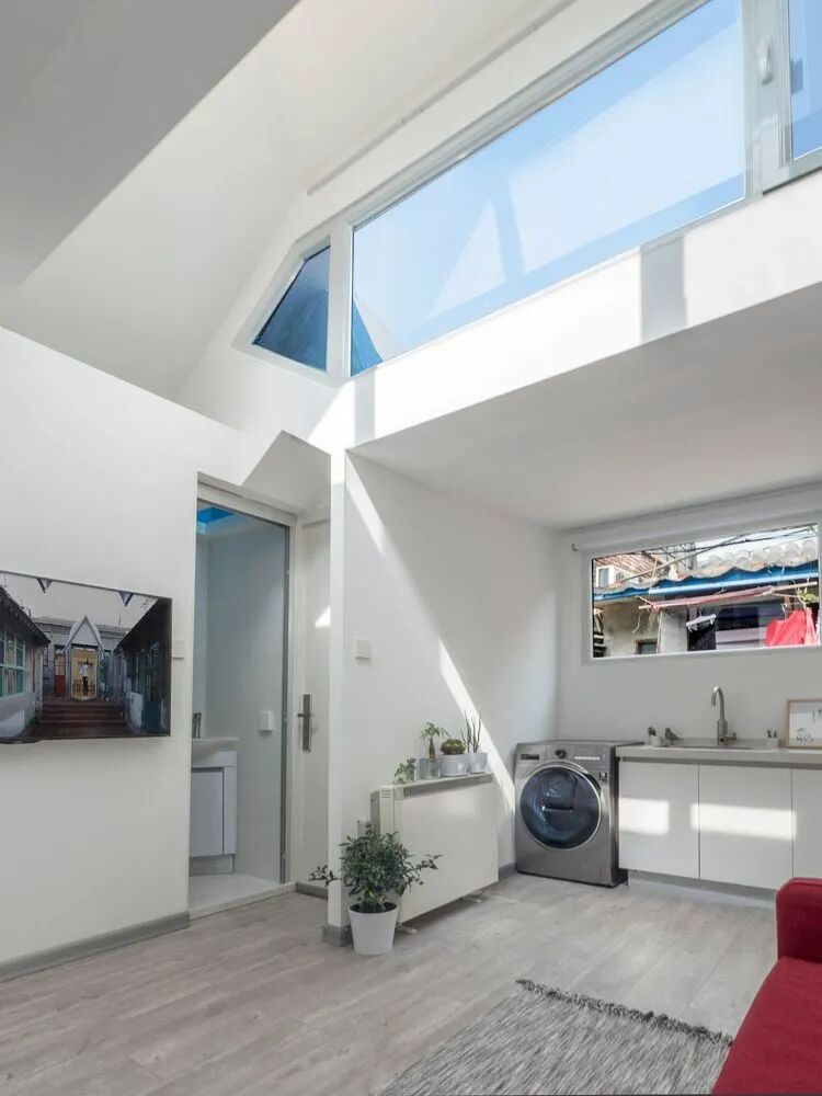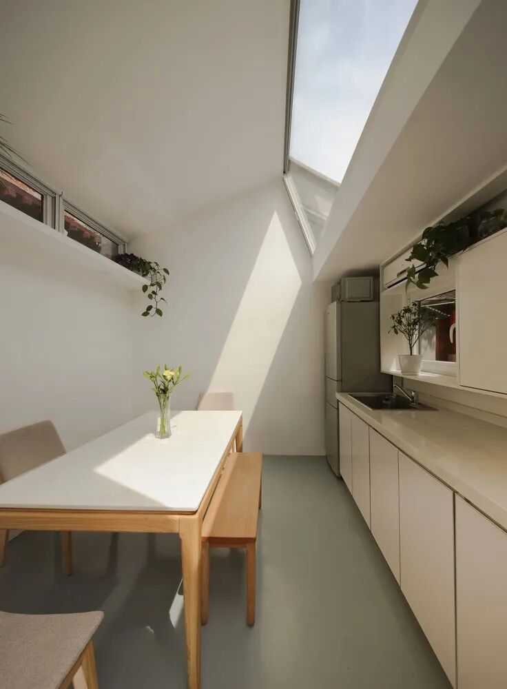 西边正房为主人居室,向北面加建出小的前厅,将正房起居空间延伸,并由一个三角形衣帽柜、临窗坐凳与卫生间等功能重新定义室内空间。北边一个集约的厨房与此加建小前厅空间由透明顶棚连为一体,中间由公共走道分开。