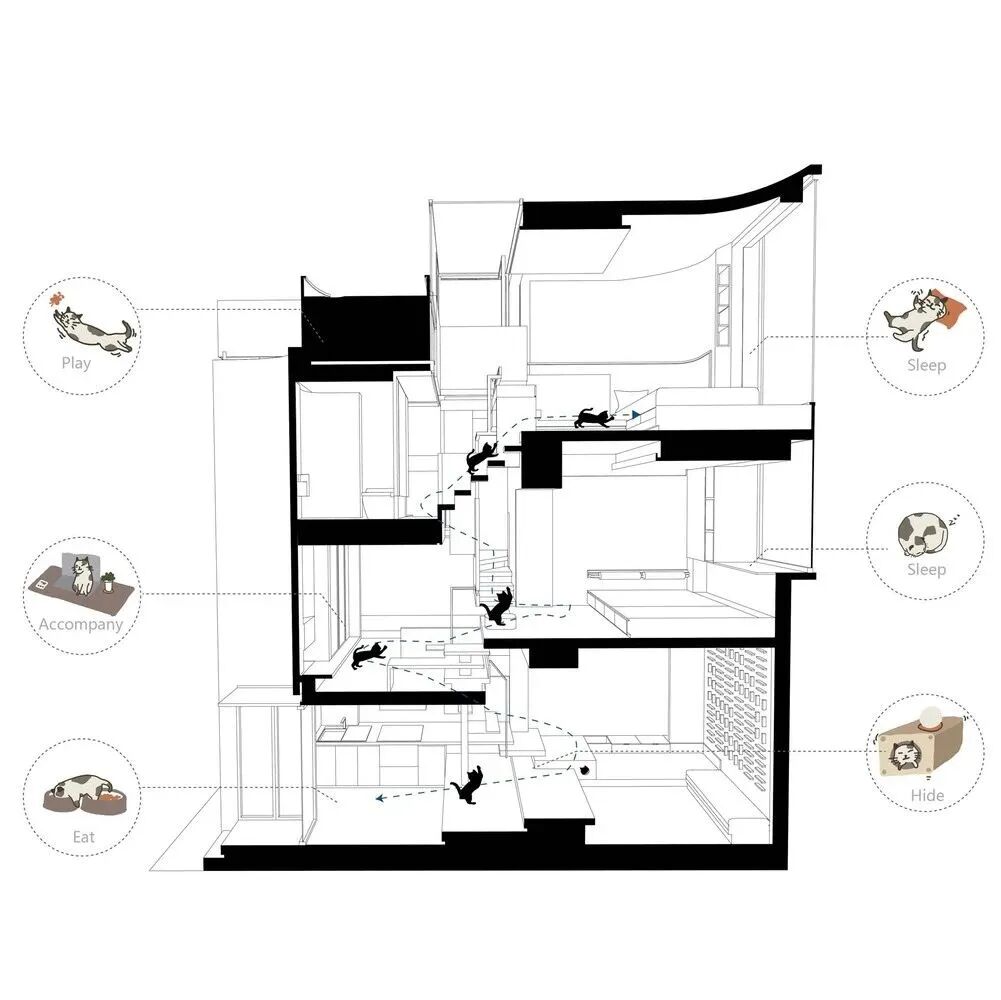 基于猫的喜高习性,设计师在每一层都打造不同的“视野平台”,空间与空间的过渡同时也可以是某个功能模块,独特的结构满足人的和猫的行为尺度、视觉感受,多层次空间让铲屎官与猫主人能有更多若即若离的互动区域,两位铲屎官也可以随时监测到猫主人的动态。