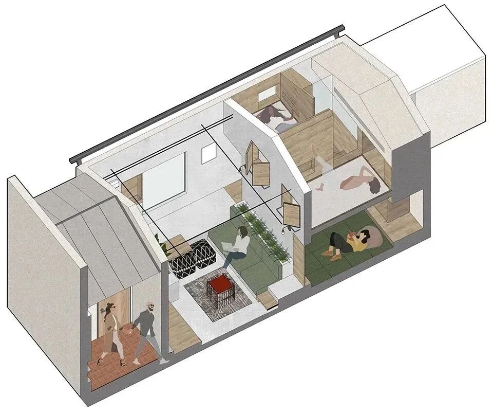 对于未来这幢建筑的使用者的定义是一组关系亲密的年轻人,因此在卧室区域与会客区域的边界处,设计师创造了两方互相交流的机会。同时门窗洞口也通过进深关系变化而成为多重空间叠合的载体