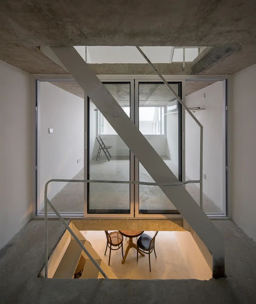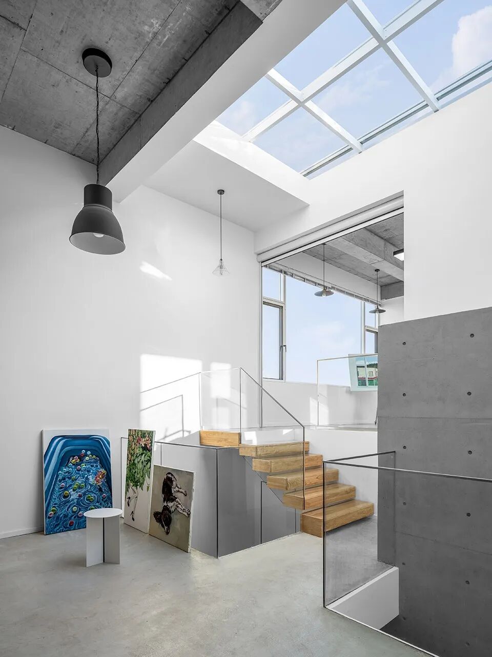 由钢板楼梯围绕自然光天井自一楼起循序向上,可以看到我们改造过的天窗和垂直采光窗以及一个纯户外空间,这是改动最大的区域。整个建筑的源发点就是从阳光和垂直空间开始。