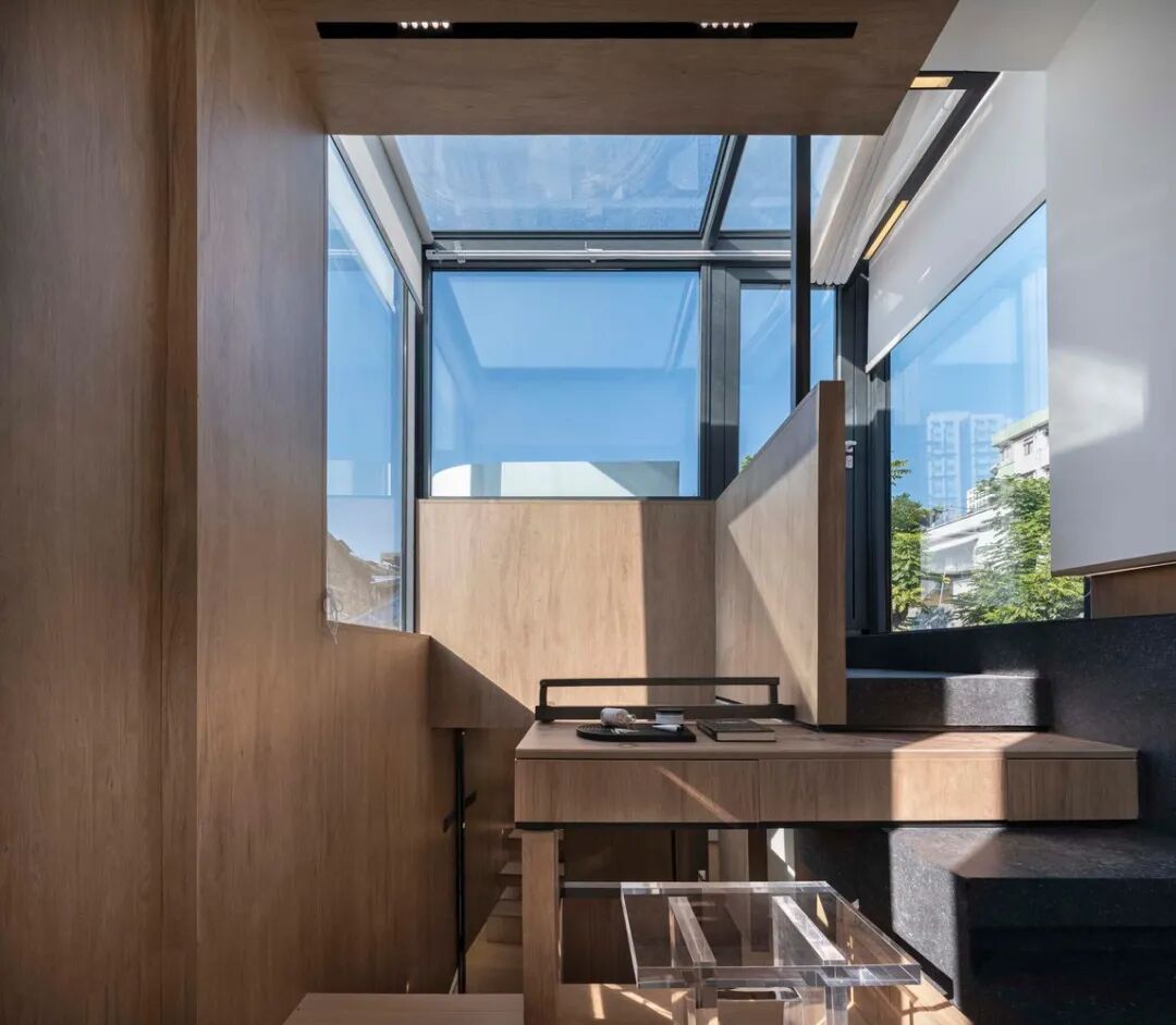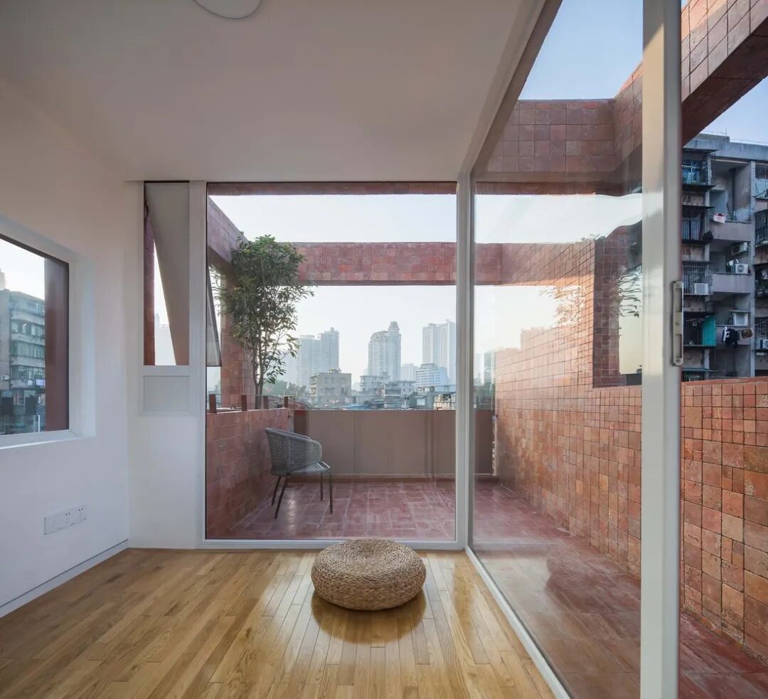 四层顶楼有一个空灵剔透的小房间和一个可以四面环顾市景的露台,它没有固定的功能,适于赏月、饮茶和沉思。
