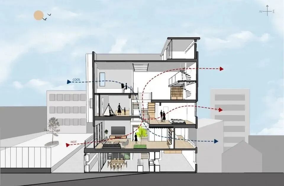 为了加强居住者之间的交流,二层到四层的楼板采用了错层与挑空结合的形式,透过1.5倍的层高既提升了起居室的空间感受;又能让画室满足挂大型的画幅的需求。同时,透过挑空和错层、不同高度的开窗和室内温差产生的气压差,加强了室内气流的流动,让空间更通风透气。