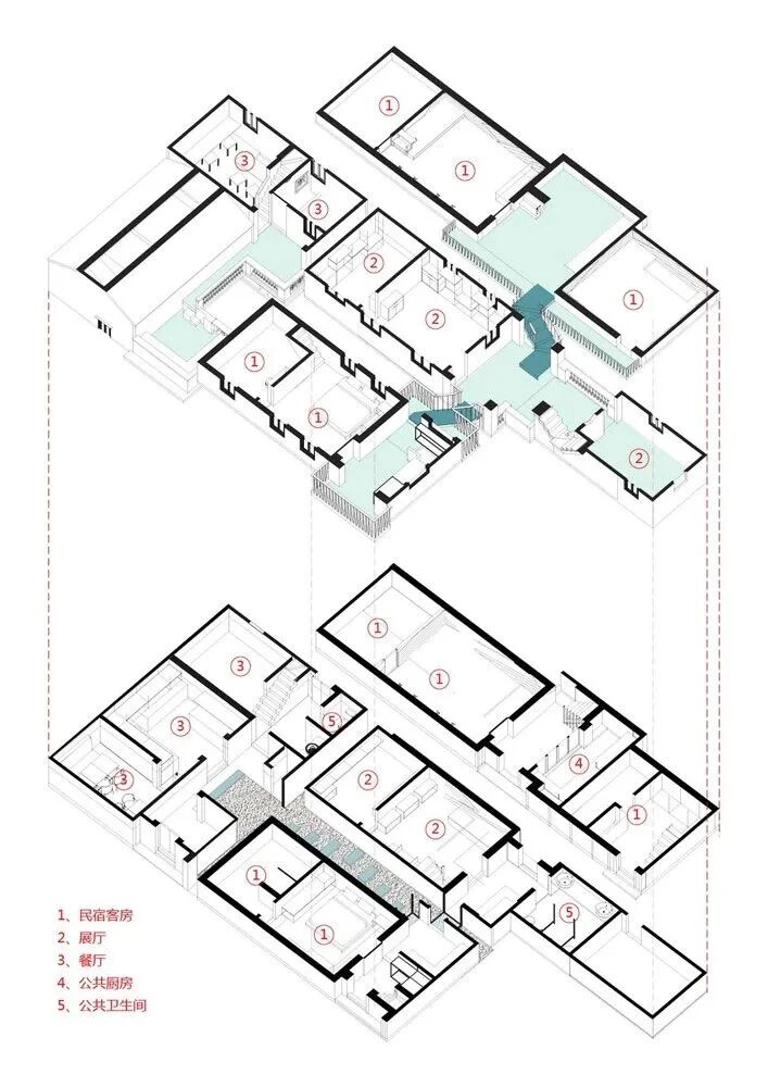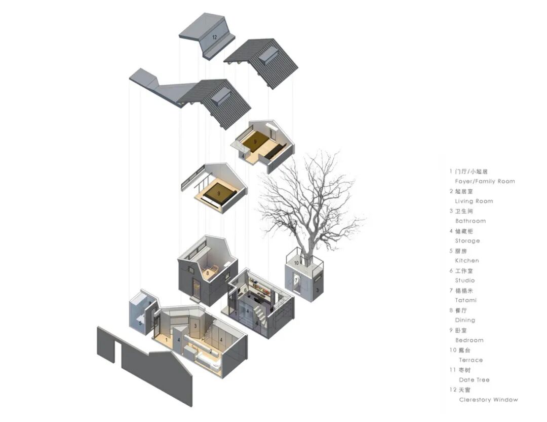 兄弟两个家庭因为回家停留时间短,以独栋极小套间的形式出现,根据尊卑长幼原则分设于二楼东西侧。父母卧室及其他日常功能房间同样遵循“风水”布局围绕着“明厅”展开