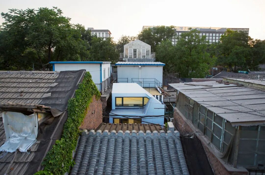 这间“插件家”是为患有幽闭恐惧症的小樊量身定做的:客厅比原来的平房高近一倍,顶部双侧都开了高窗,阳光能够铺洒在室内的每个角落。卫生间屋顶隐藏的蓝色顶面,让这个小空间在雾霾天里也能反射出湛蓝的天光。屋顶平台让小樊在拥挤的胡同环境中拥有一片能够呼吸的小天地。