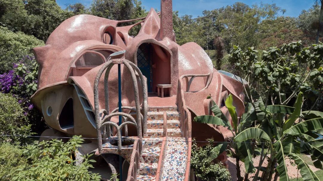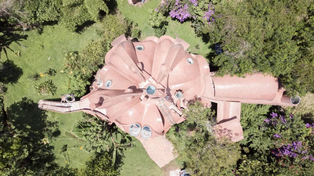 该住宅建筑的奇异外形引人注目,展现了一种抽象化艺术。据屋主说,它曾被不同的人称为蘑菇、章鱼、蝙蝠洞甚至蛋白酥皮。建筑的异形表皮采用大地色的混凝土制成,形状奇特的窗户使用了彩色的马赛克玻璃。