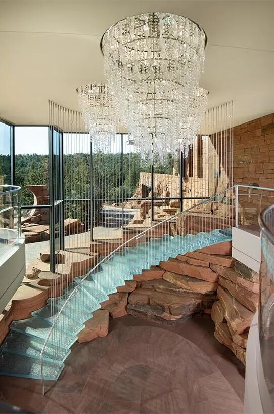 环360度的落地玻璃窗为室内提供了广阔的视野,室外的红色岩石延用到室内,大量层叠的石雕丰富了室内装饰,将玻璃等具有反射特点的材质衬托地更加透亮、纯粹,形成鲜明的对比。