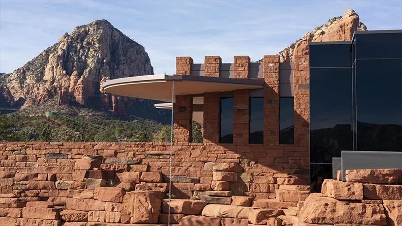 该住宅位于美国亚利桑那州,从一片红色的岩石中拔地而起,两个半圆形的悬挑屋檐为炎酷的夏季遮阳,同时又可以让冬天的阳光浸透室内。