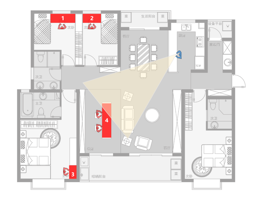 我考虑了4个点位,作为大人和小孩工作的位置。为了避免声音带来的相互干扰,基本都是各自独立的。