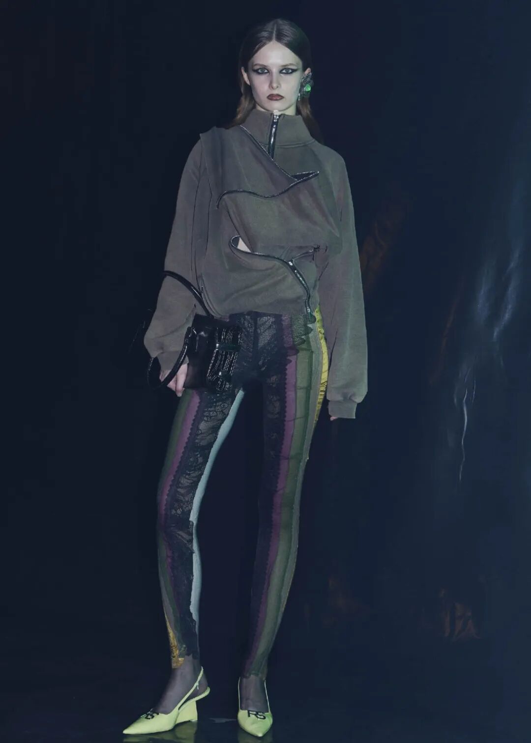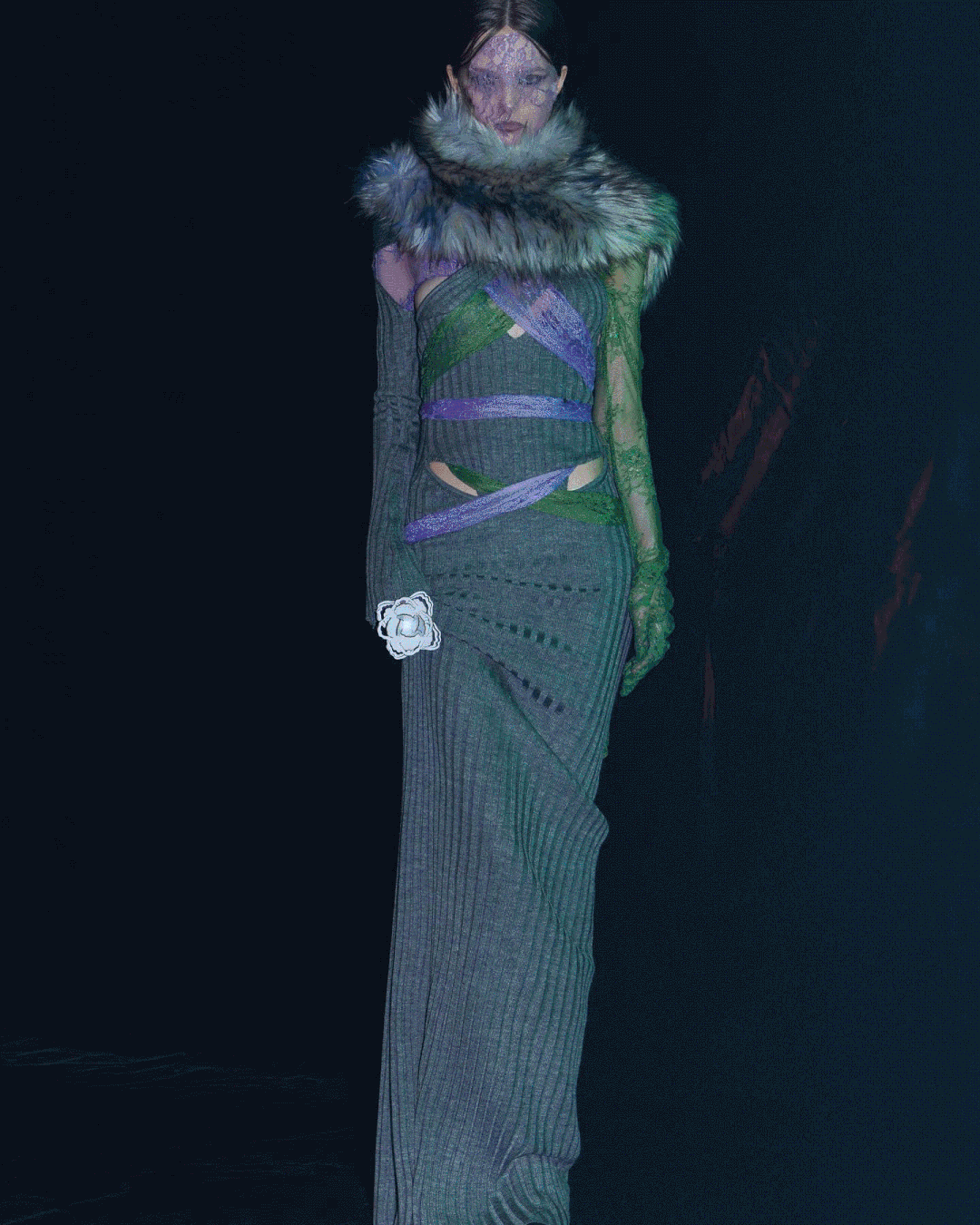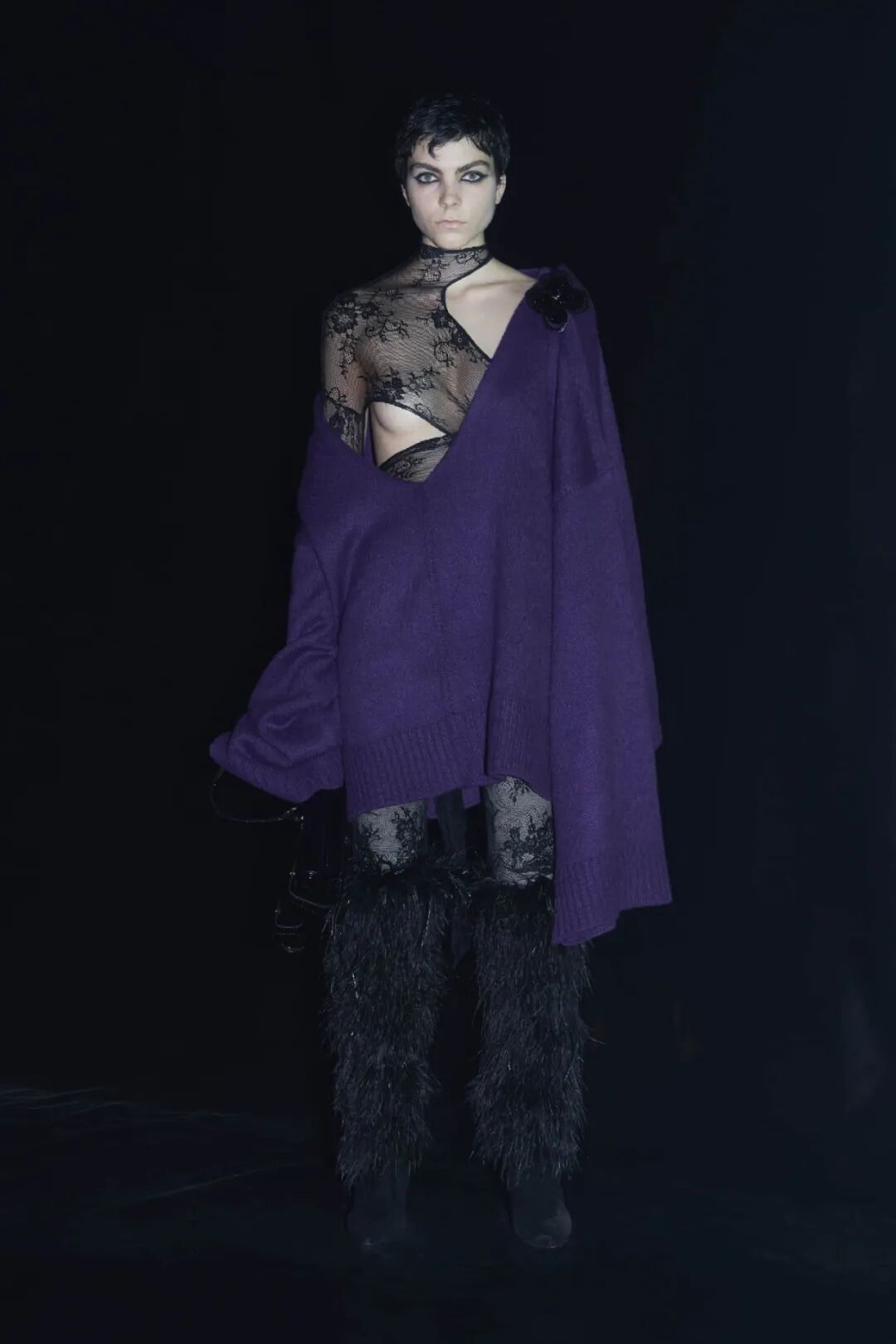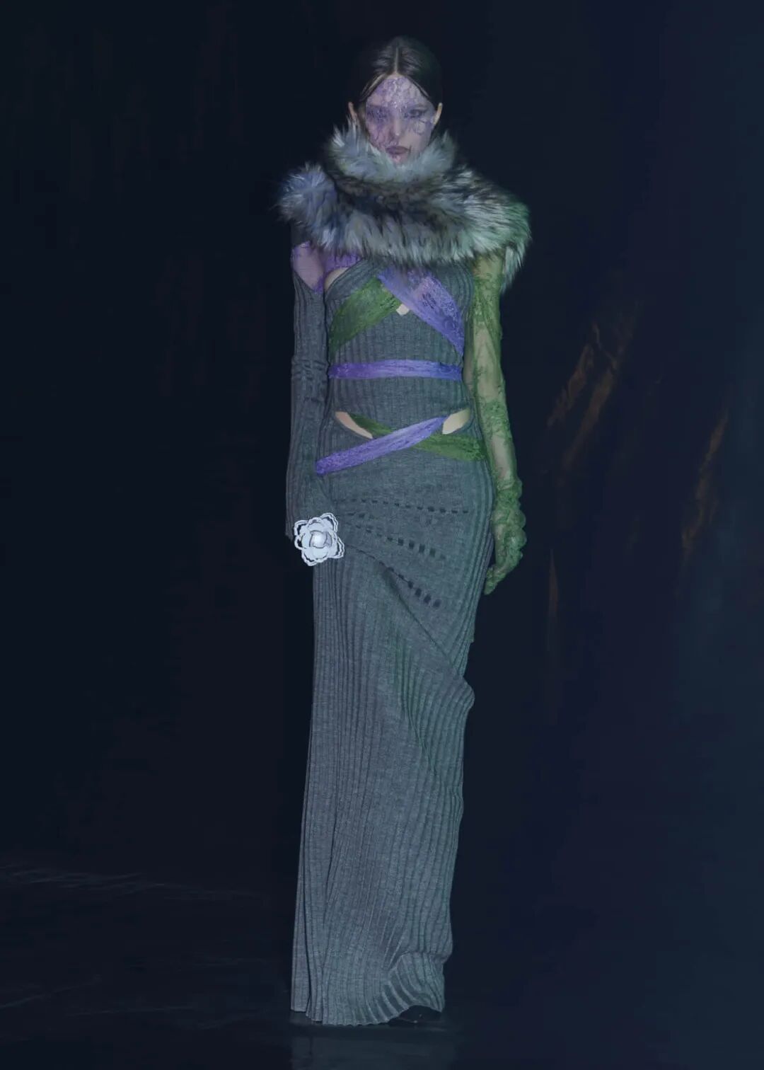 模特们穿着轻薄的蕾丝和厚重的针织,扭曲的卫衣和整块缠绕的面料,随意披挂的针织外套和毛茸茸的长靴,似乎都表示着一种失控之下的应付和随意,以及参杂其中的凑巧的浪漫气息。