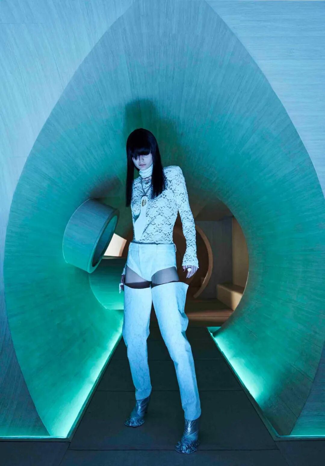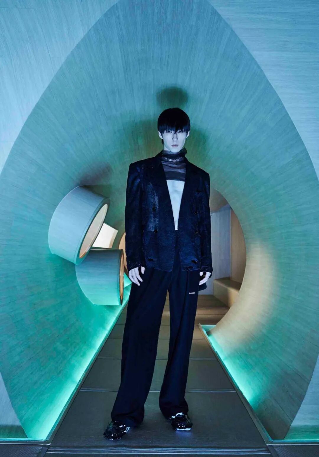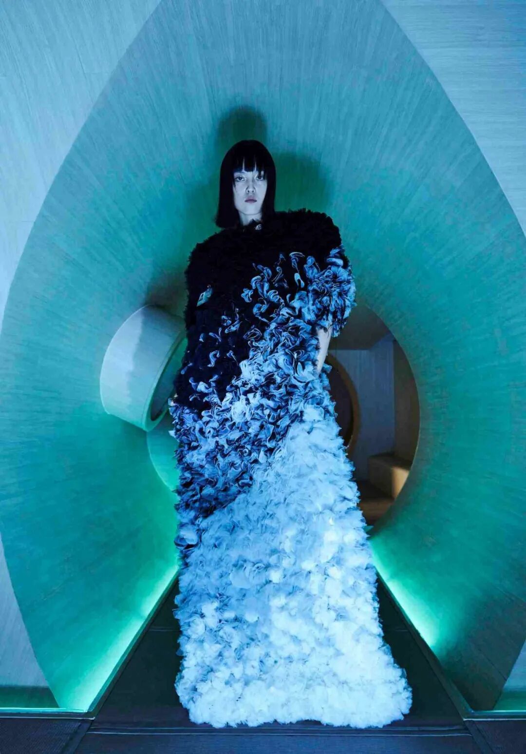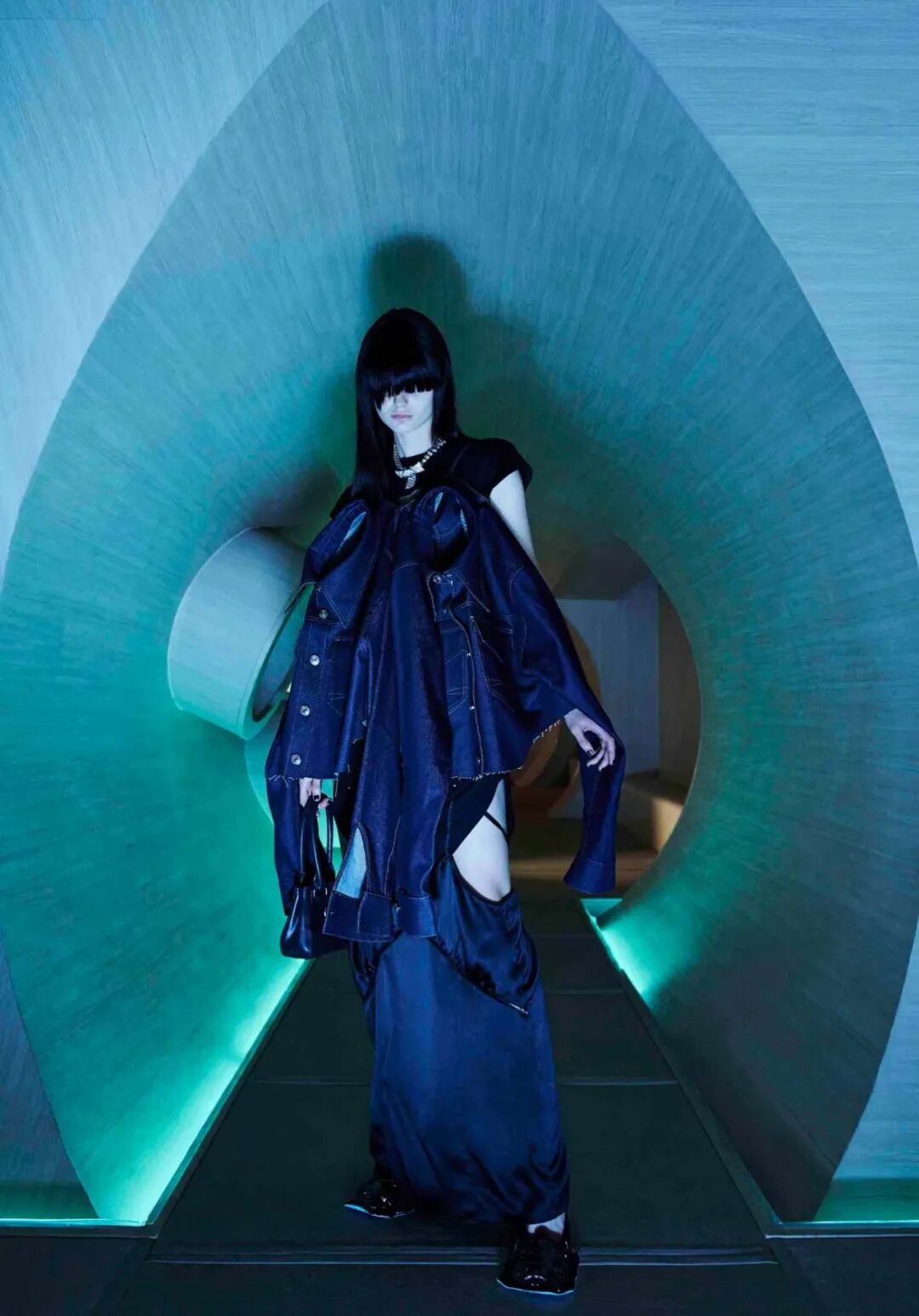 设计师通过几何形的场景布置,增加服装给人们所带来的视觉冲击,这种先锋的、未来感的冲突与对比正是设计师所强调的,品牌所带来的感受。