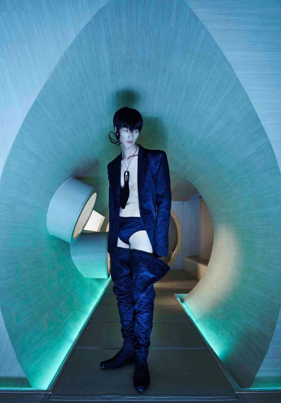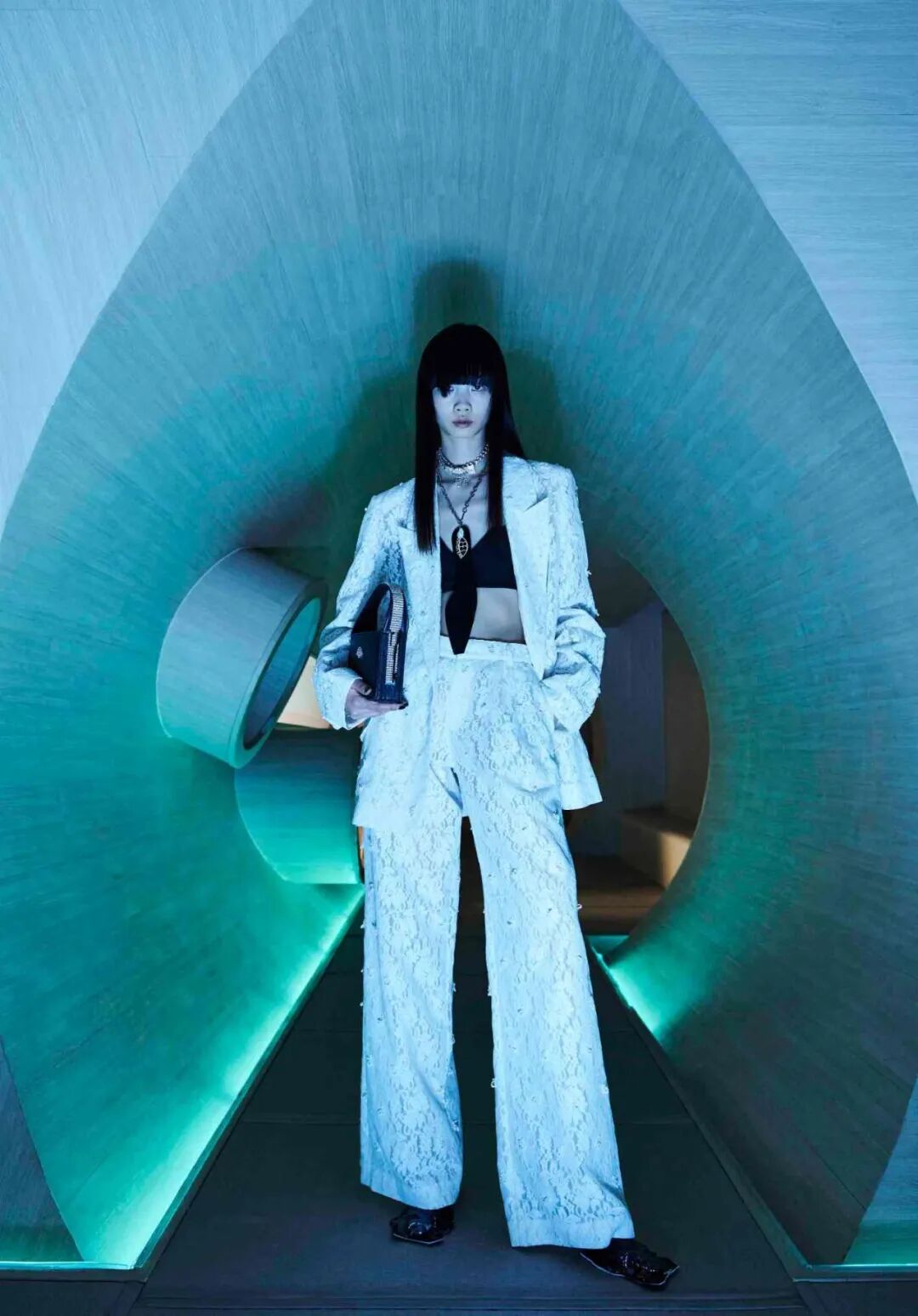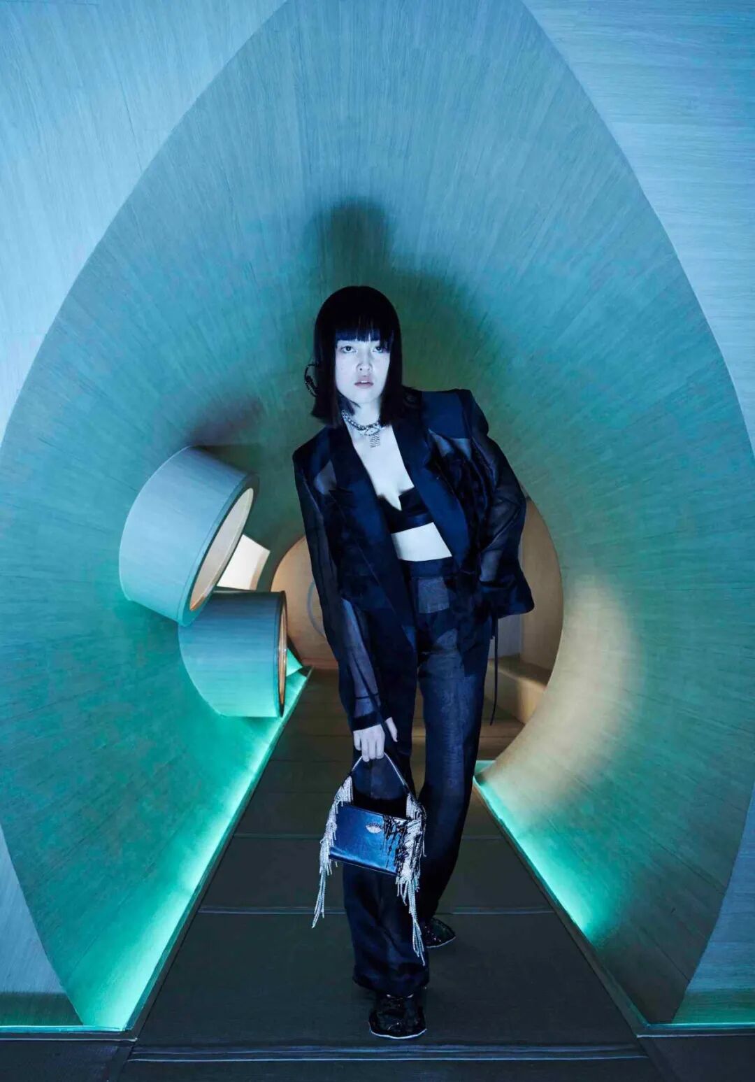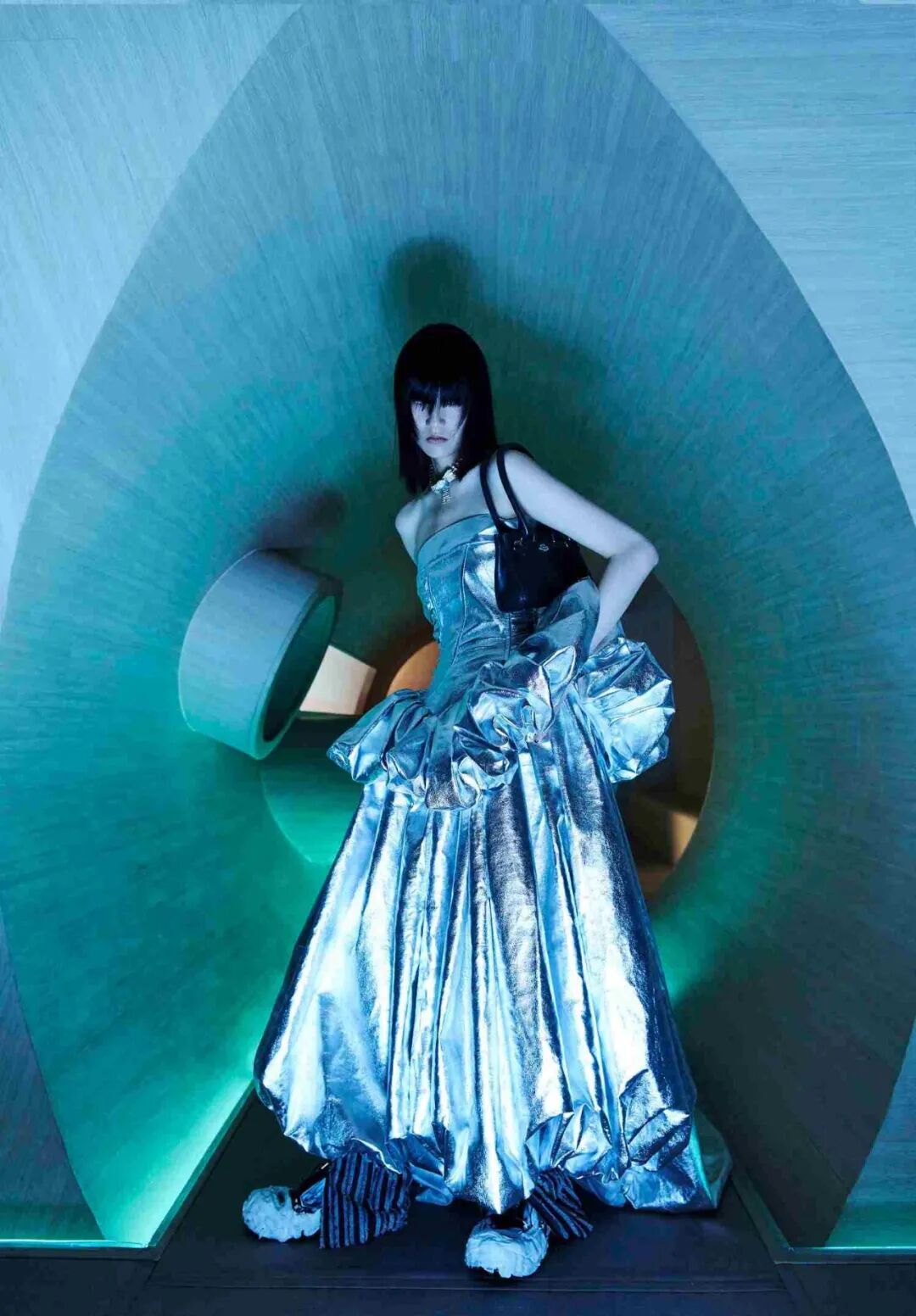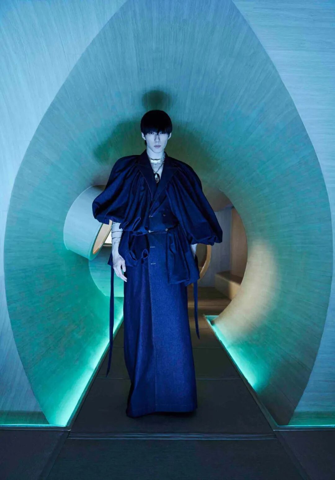 设计师通过几何形的场景布置,增加服装给人们所带来的视觉冲击,这种先锋的、未来感的冲突与对比正是设计师所强调的,品牌所带来的感受。
