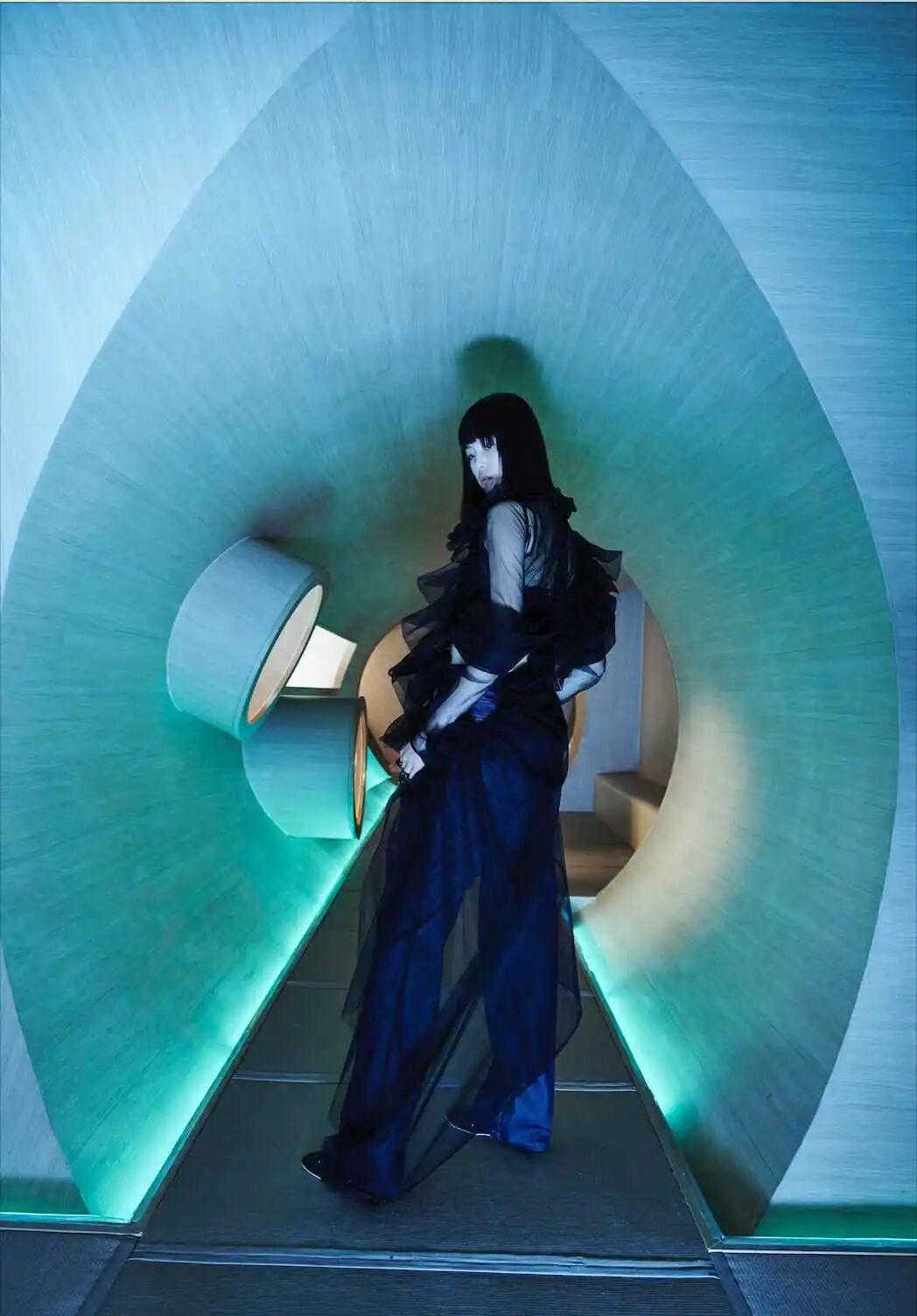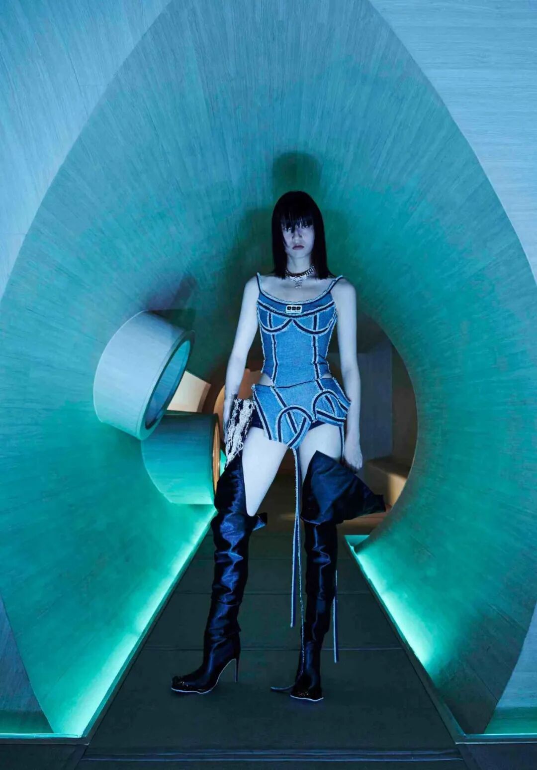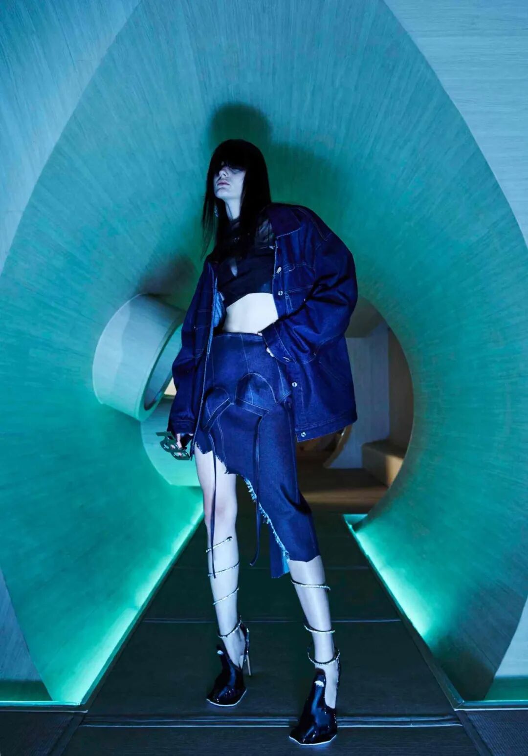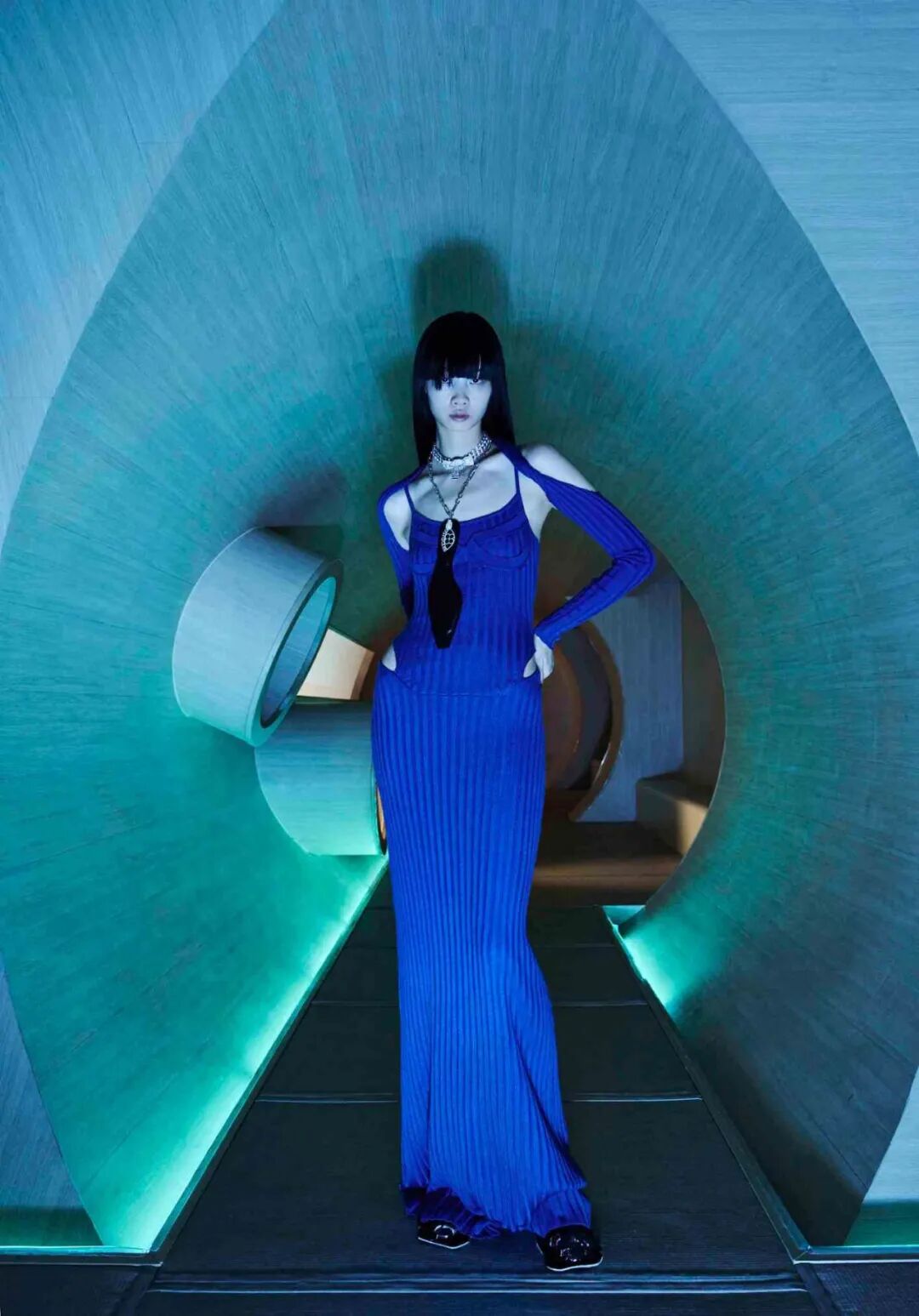 设计师通过几何形的场景布置,增加服装给人们所带来的视觉冲击,这种先锋的、未来感的冲突与对比正是设计师所强调的,品牌所带来的感受。