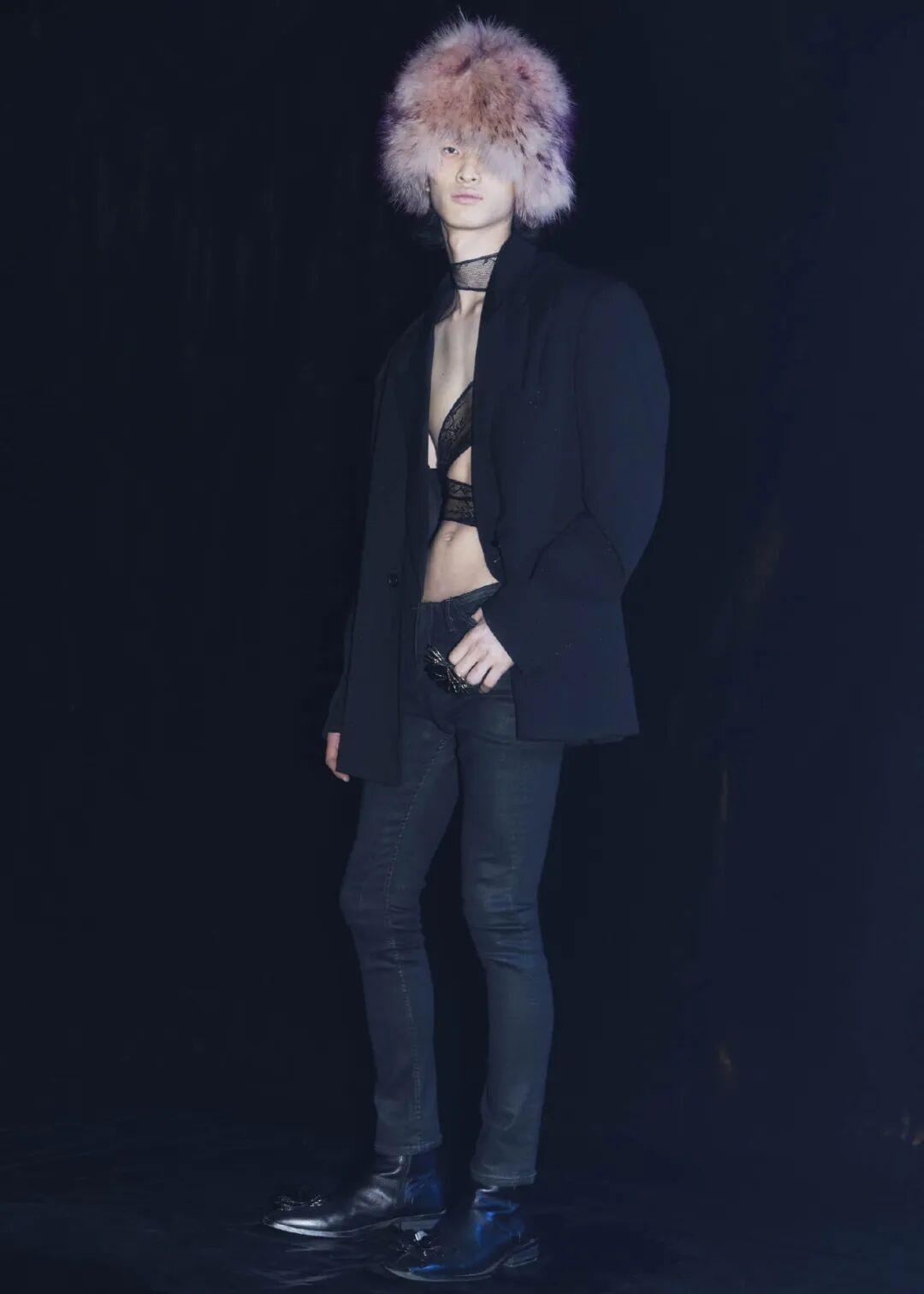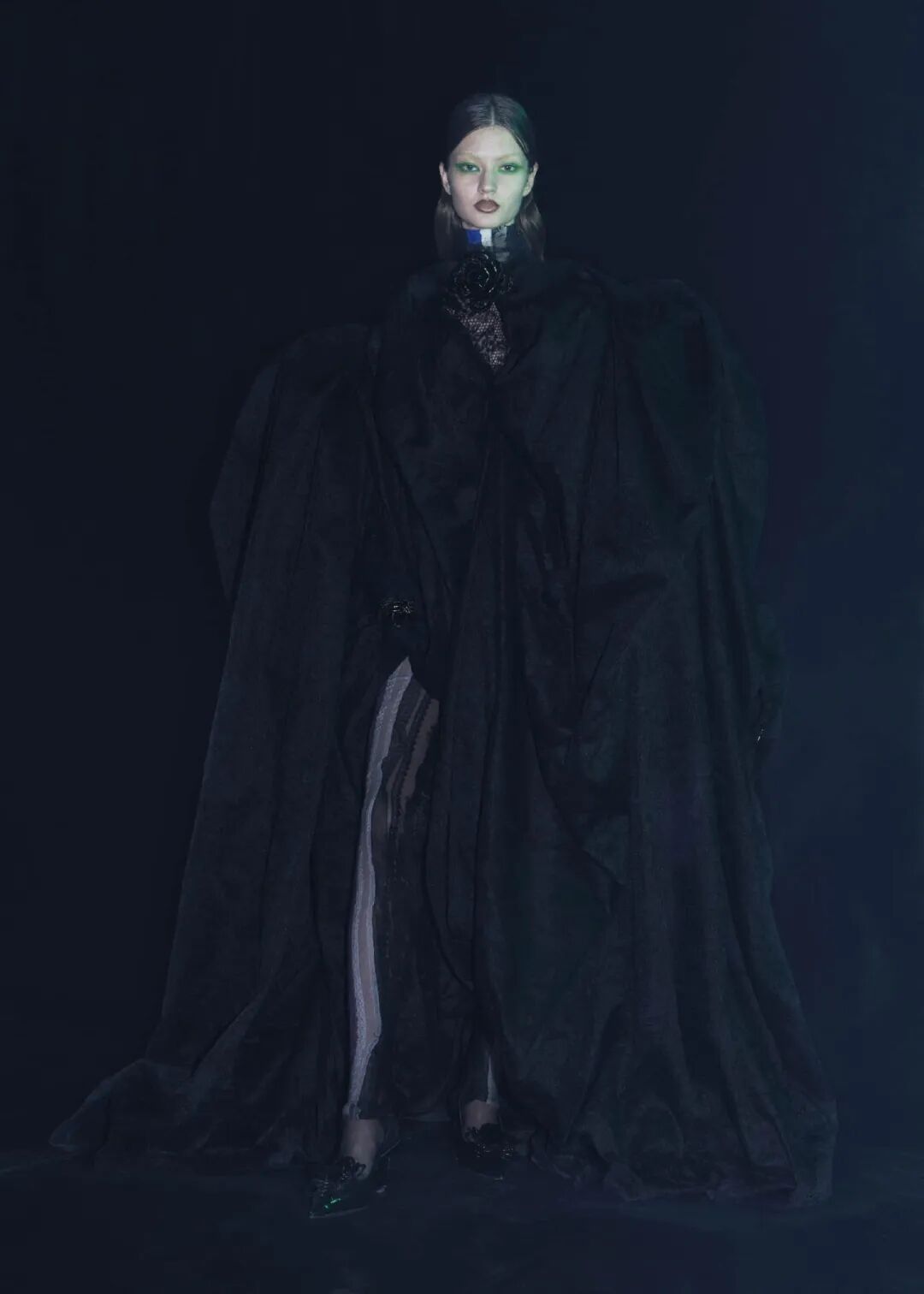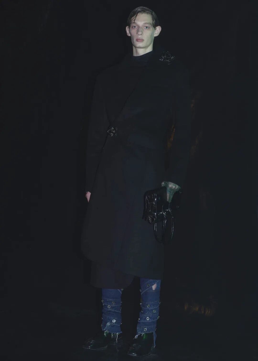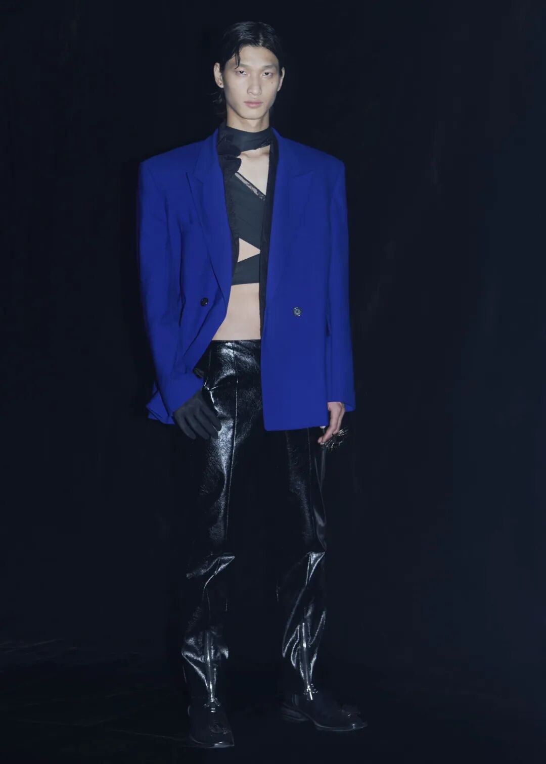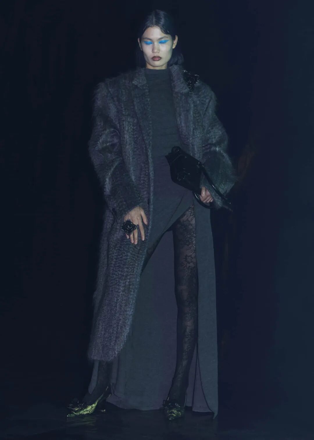 2022/23秋冬系列的成衣秀场,凝结着水珠的地面,整体黑色的布景和集中的灯光,好像空气也变的湿润了,刚刚经历过阵雨的洗礼,兵荒马乱的气息还没有完全褪去。而“疫情”下的我们也都或多或少的经历了这一场兵荒马乱。