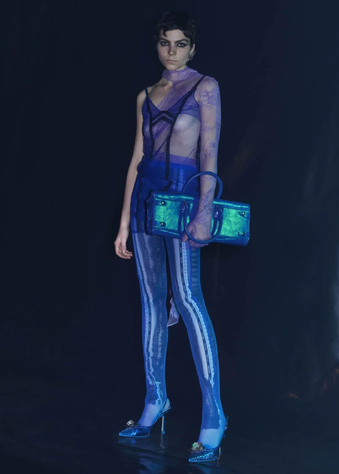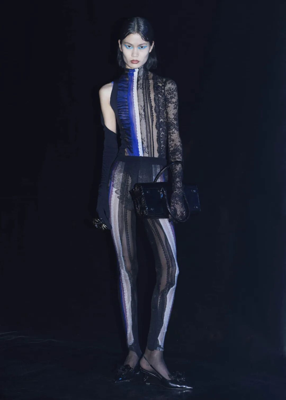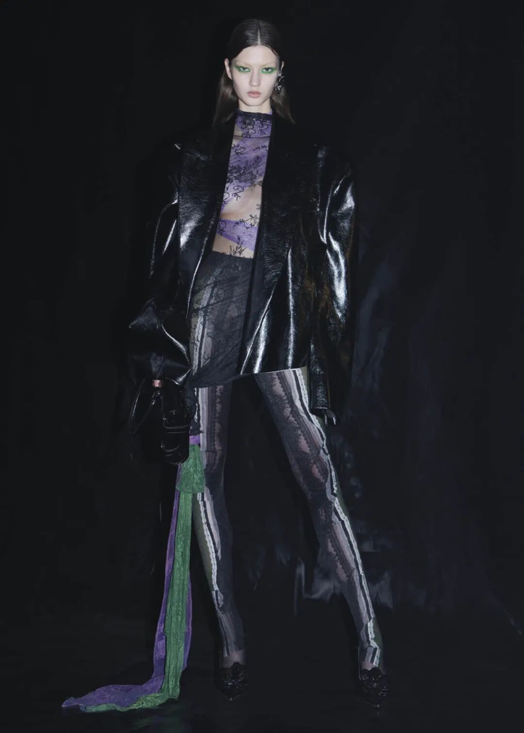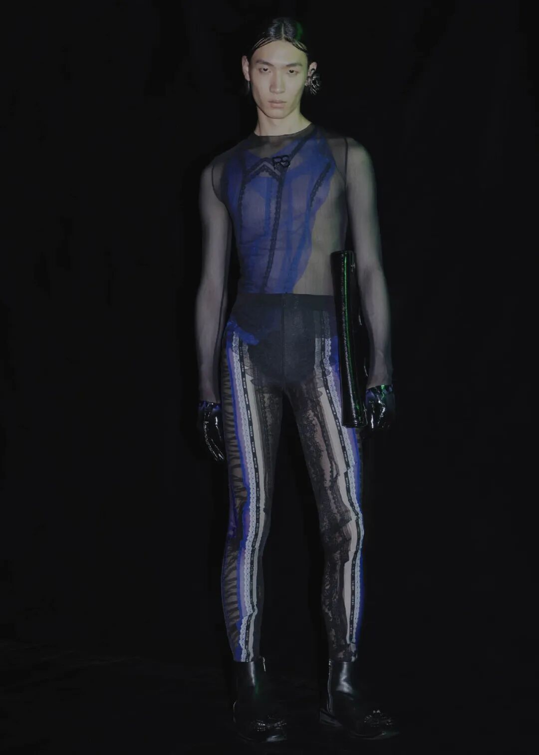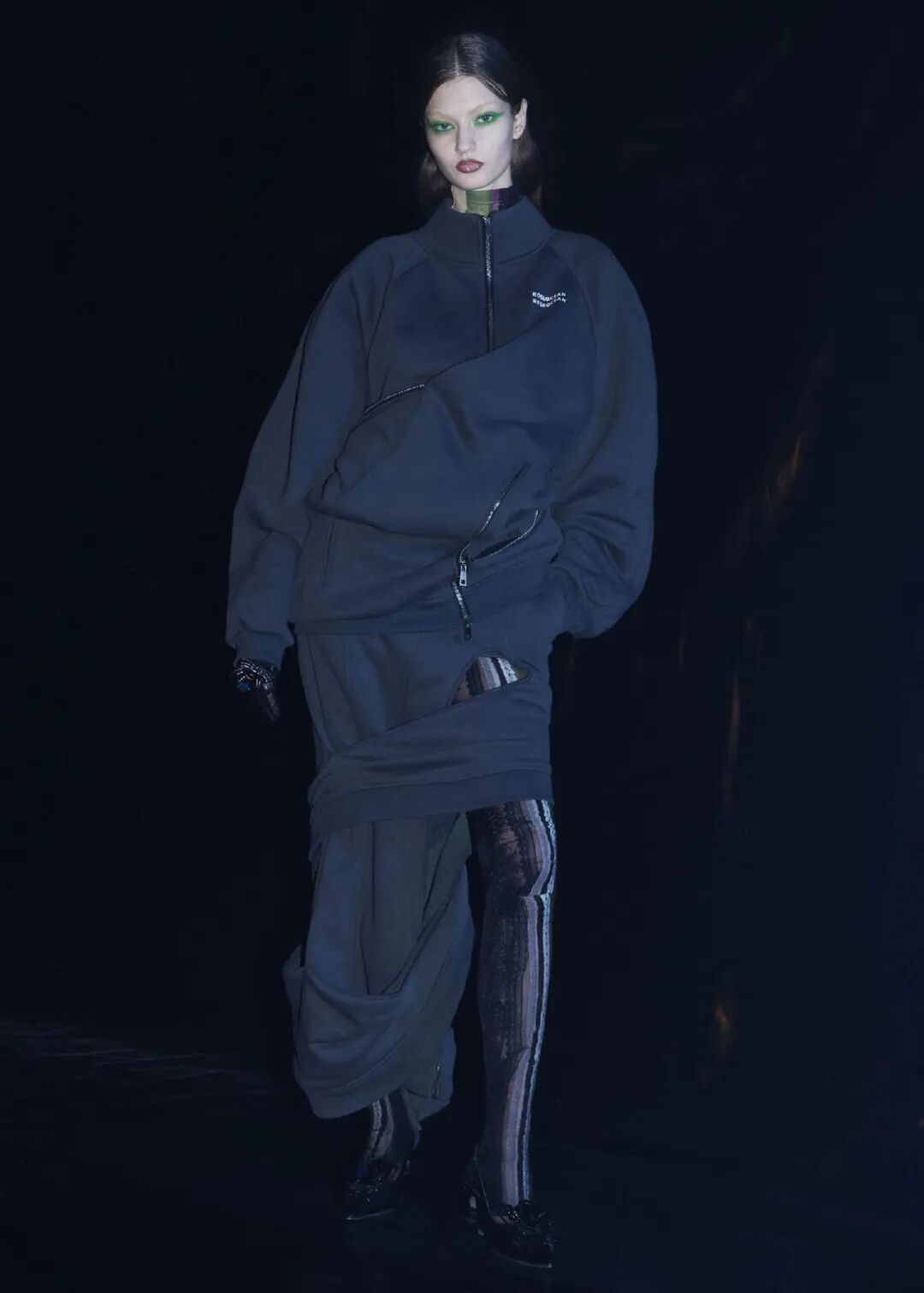 2022/23秋冬系列的成衣秀场,凝结着水珠的地面,整体黑色的布景和集中的灯光,好像空气也变的湿润了,刚刚经历过阵雨的洗礼,兵荒马乱的气息还没有完全褪去。而“疫情”下的我们也都或多或少的经历了这一场兵荒马乱。