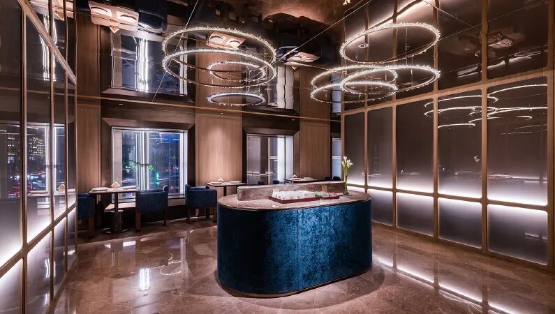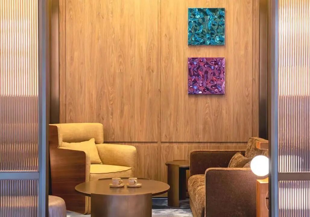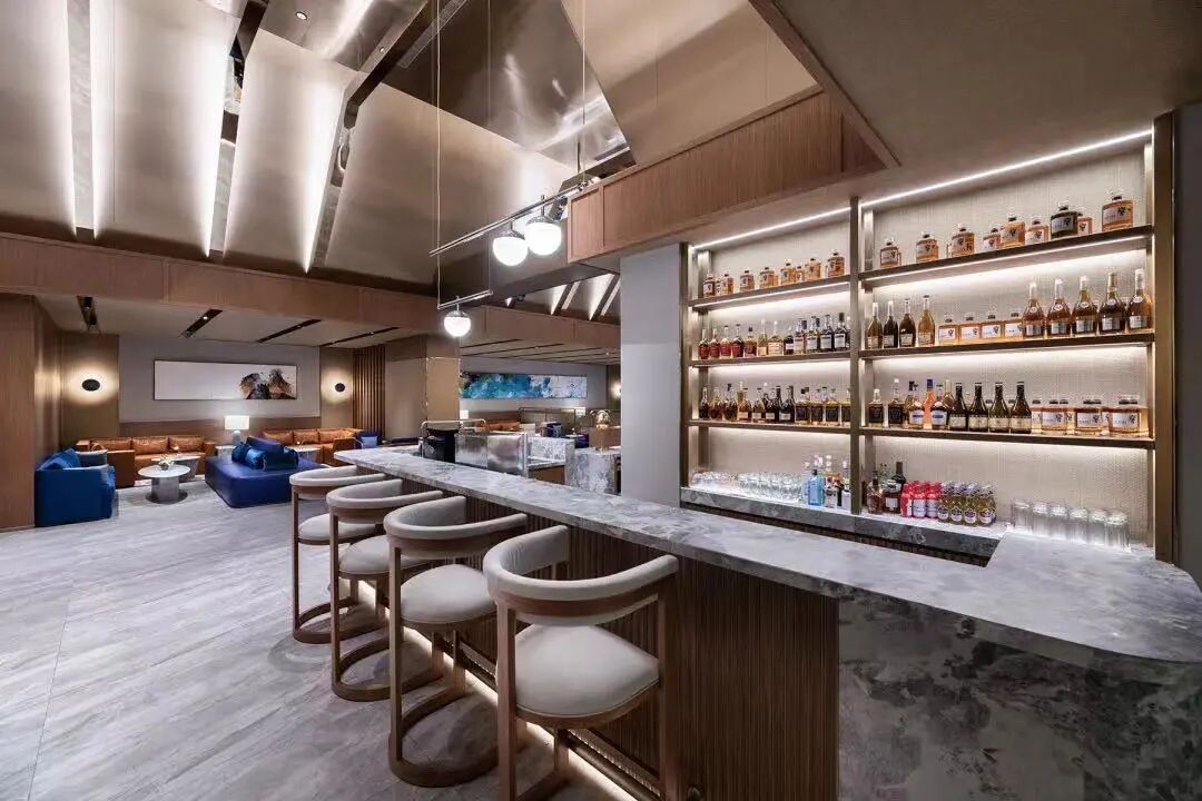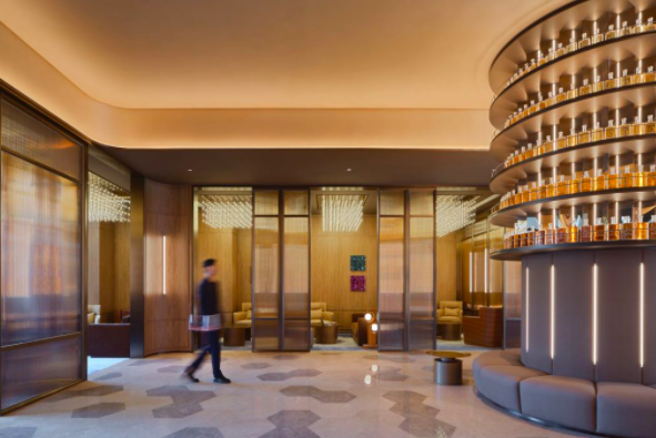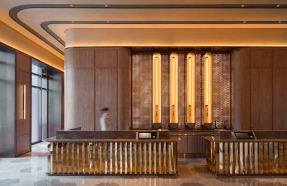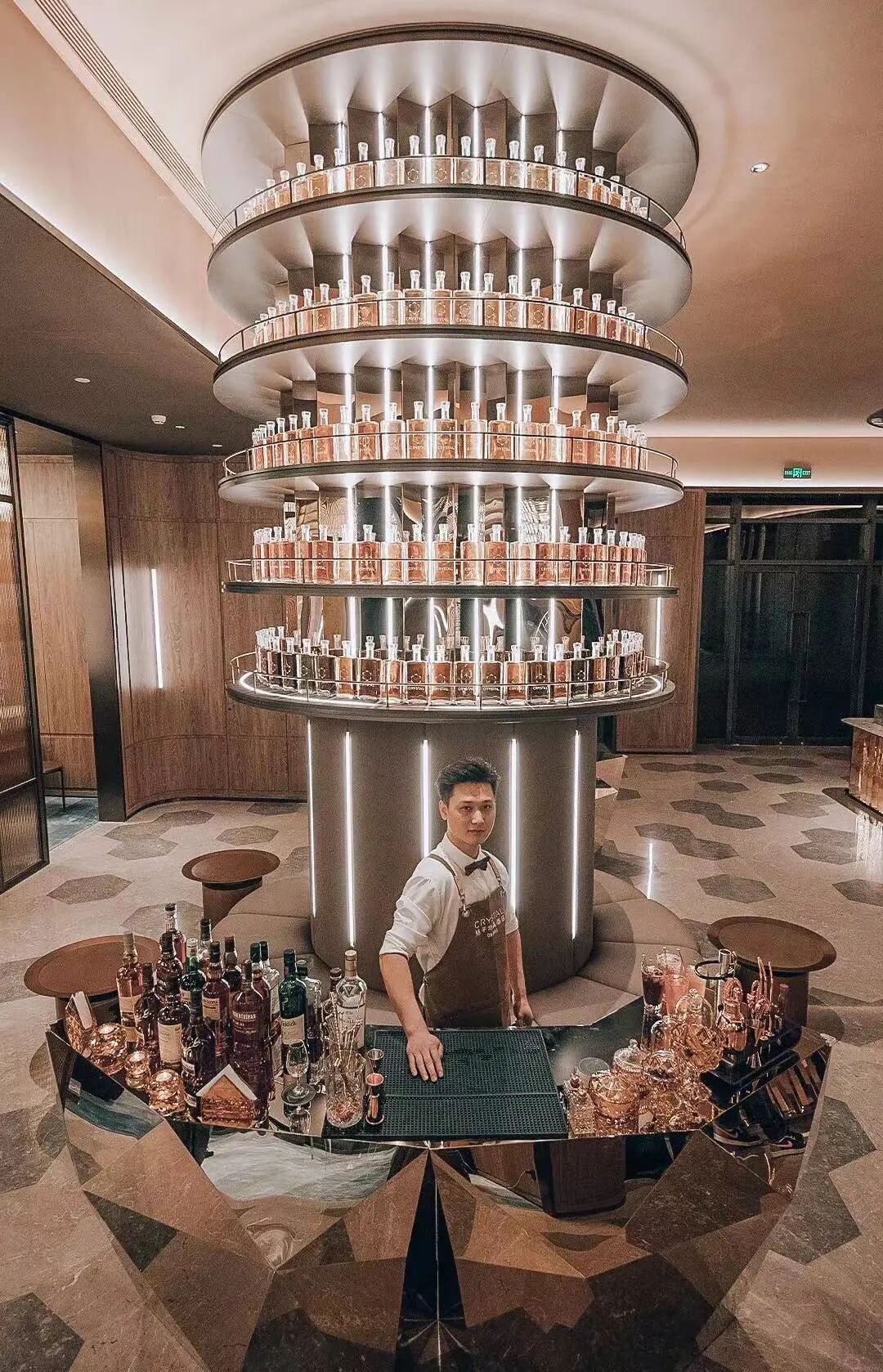 全新的水晶酒店与以往人们对于中高端酒店的印象大不相同。酒店入口处的无限镜像打造出让人瞬间放松的视觉感受;大堂整体空间采用胡桃木、古铜、玻璃三种不同材质的组合和立面造型,打造出威士忌主题设计的品质感;半私密的空间隔断,优雅舒适。而客房内的暖棕色皮革及木饰面的搭配,营造出更为舒适、稳重的休憩氛围,让客人可在静谧中感受水晶的格调。