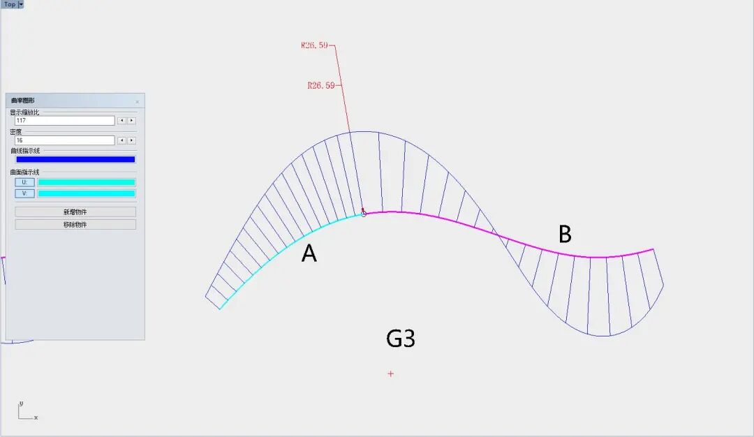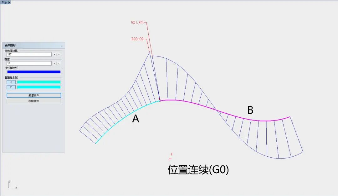 图中的蓝色线条称为曲率梳。竖向的长短不一的蓝色线段代表曲线在某一点处的曲率值。r则代表了曲率半径,即最接近该点处曲线的圆弧的半径。曲率和曲率半径互为倒数。蓝色线段越长,曲率值越大,说明曲线在该点处越弯曲。