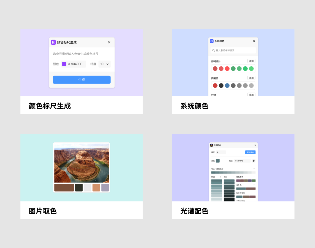 前面没提到的颜色类插件中,仅是用来提供配色方案的就有“颜色标尺生成、系统颜色、光谱配色、图片取色”四种。