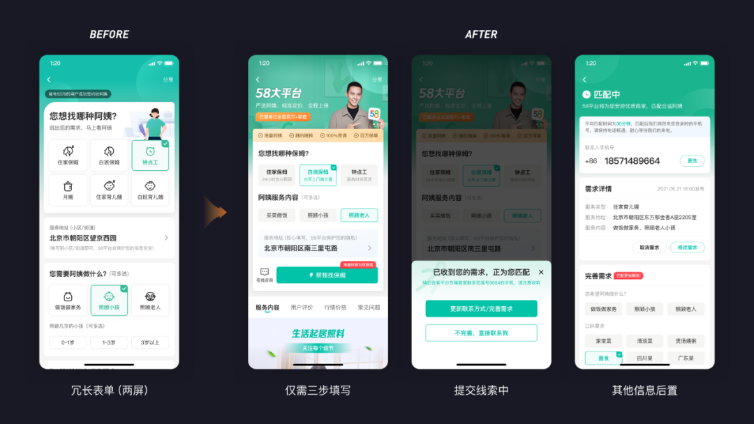 用户端在整个生态中的产品定位是打通流量到转化,承接后续服务体验的一个业务模式,那么从众多流量中转化成用户线索则是链接中非常重要的环节,而需求页则是我们获取用户线索的一个重要的转化路径。服务流程从时间维度主要划分为服务前、中、后三个阶段。在服务前,用户通过平台进入到需求填写页,成功提交需求后,商家会及时分配经纪人跟进,为用户推荐合适的阿姨沟通面试,此阶段服务都是在线下进行的,而在双方协商一致后就会回归到线上签约的流程,再到阿姨上门服务、服务完成、后续的售后回访。
