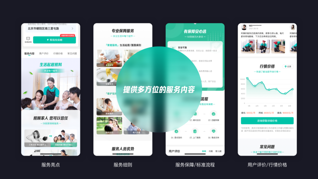 随着近些年家政市场规模扩大和用户需求的不断上升,越来越多的用户养成了在线上寻找家政服务的习惯。但提到家政行业,可能很多人的第一反应是保洁相关的服务,但实际上家政行业里包含了保洁、保姆、月嫂、维修、搬家等不同垂类业务。在此背景基础之上,我们在去年底推出了家庭服务产品,主要核心是保姆、月嫂、育儿嫂这三类业务,通过线上下单结合线下服务,将传统的家政行业互联网化。目前业务主要分为三端产品: