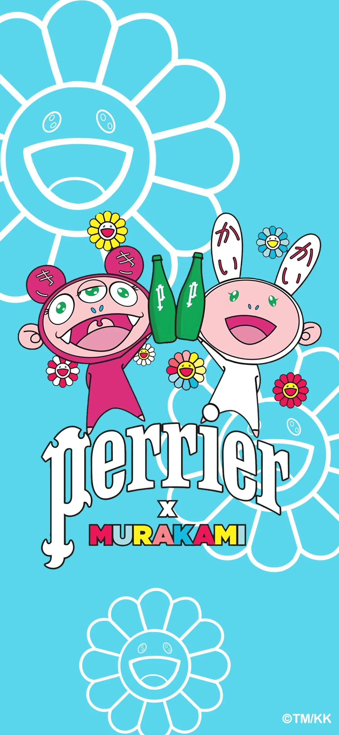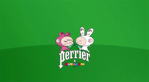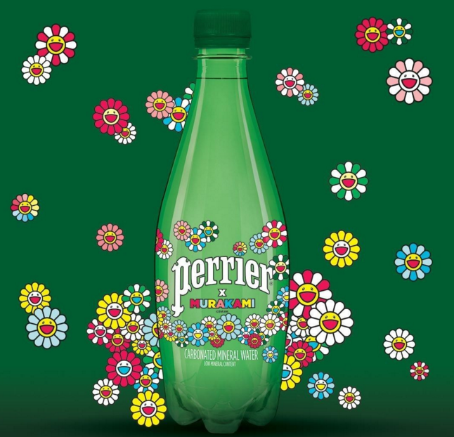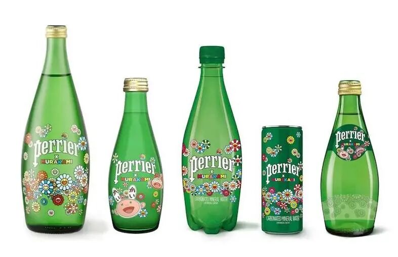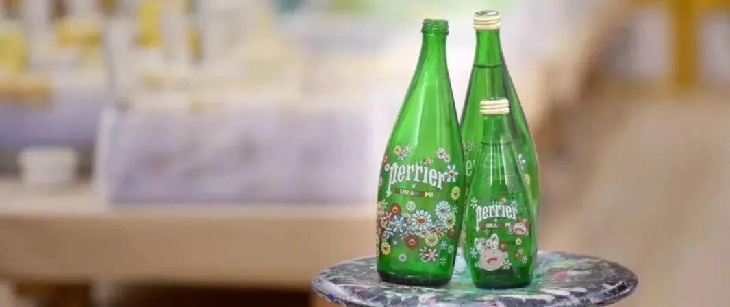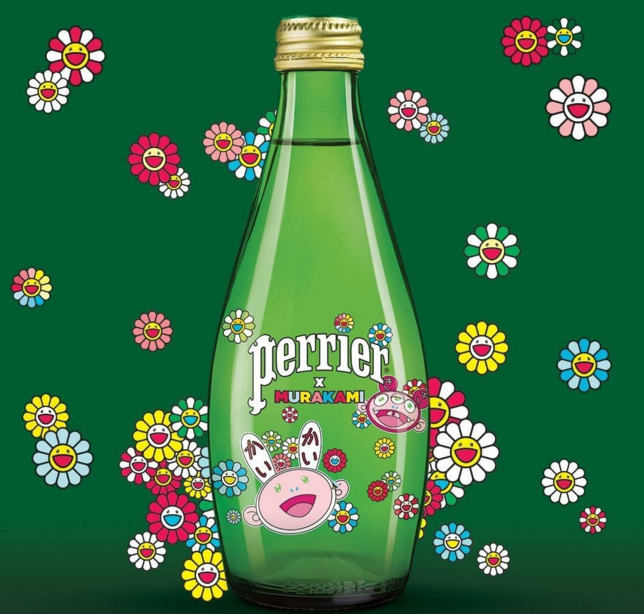 前年,巴黎水Perrier与日本艺术家村上隆达成合作,将超扁平运动风格的kaikai&kiki画上经典的巴黎水绿色玻璃瓶身!