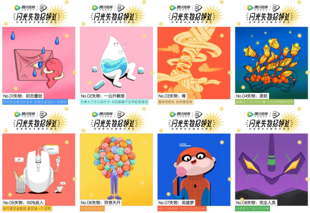 用八个不同方向的失物招领主题,连接学生群体遗失的爱情、丢失的友情等一系列美好的精神物质,通过与影视和综艺作品的影像一一对应,找回那些青春的宝藏。