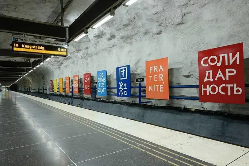 ▲ Tensta站,在当年该站所在区域大量移民迁入的背景下,艺术家以萌趣的原始画风涂鸦,不同国家语言表达的“团结”标识牌等,表达了对于多民族、多文化融合的美好意愿。图源网络
