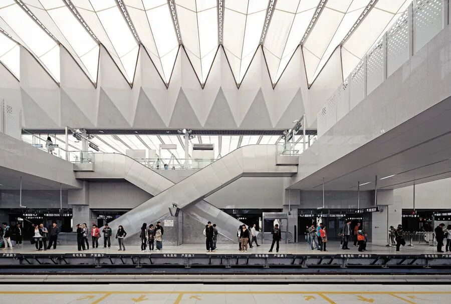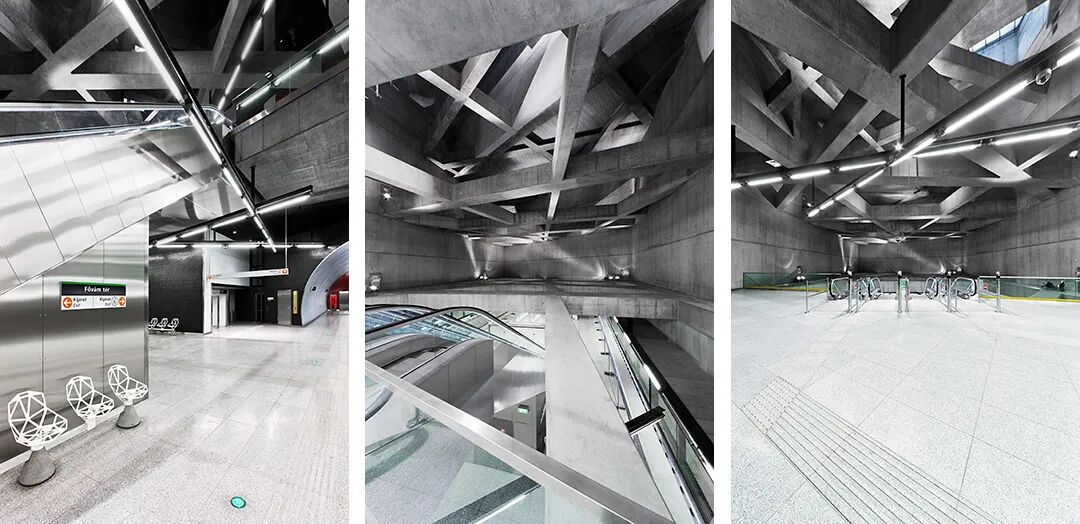建筑师采用骨骼系统式的混凝土结构,三个层次的钢筋混凝土梁穿梭其中,虽然让人眼花缭乱但却具有统一感与壮观性。车站的地面入口处设置了一系列有机晶体状的天窗,阳光倾泻而下,洒落在电梯切出的“深谷”里,透过层层混凝土结构的空隙,到达地底世界处。
