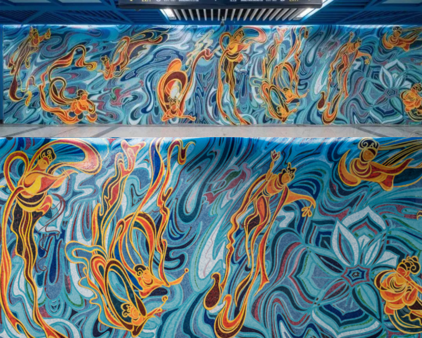 当地铁公共艺术浪潮席卷到国内,最早的创作实践始于1984年北京西直门地铁站,《燕山长城图》、《大江东去图》、《中国天文史》等以壁画的形式作为彼时国庆35周年的献礼作品面世。