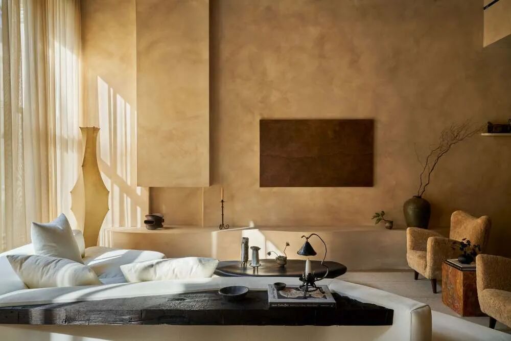 其主要运用了木、石、藤、布、皮这五种材质,软装家具选型在空间里各部分的占比。多采用的是原创品牌,提高了空间的
