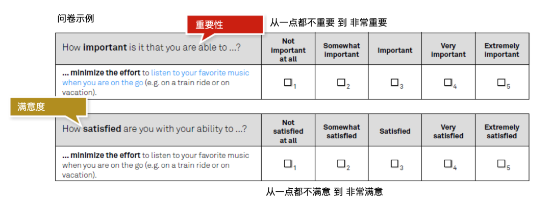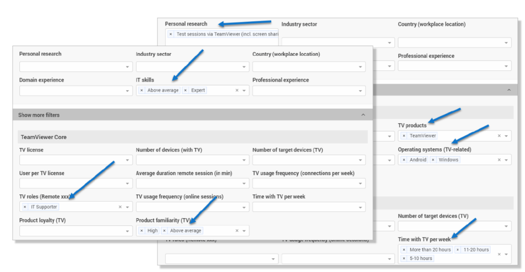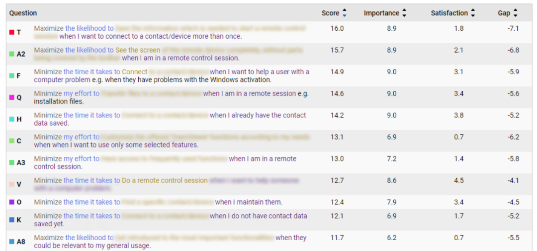 JTBD 调查:列表视图。首先关心更相关的需求(更高的分数)是有意义的。(“TeamViewer 用户关注计划”截图)
