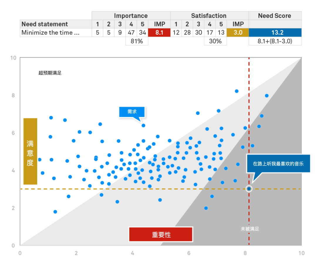 JTBD 调查:地图视图在“重要性-满意度”图上显示需求分布。(不仅)右下角的点很有趣。(“TeamViewer 用户关注计划”截图)