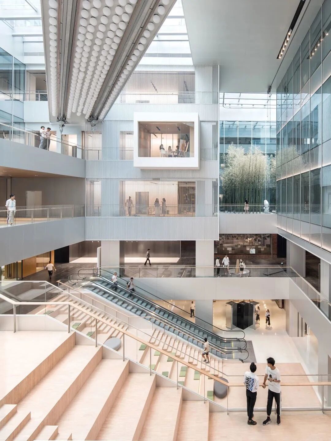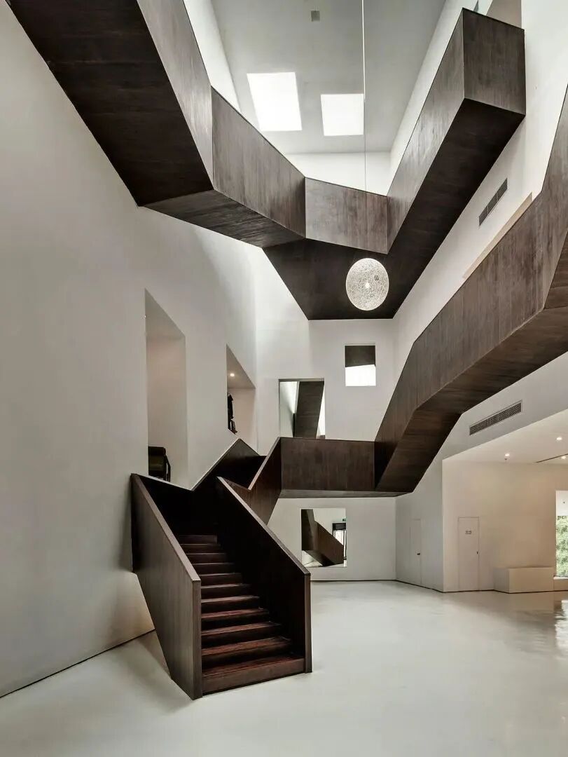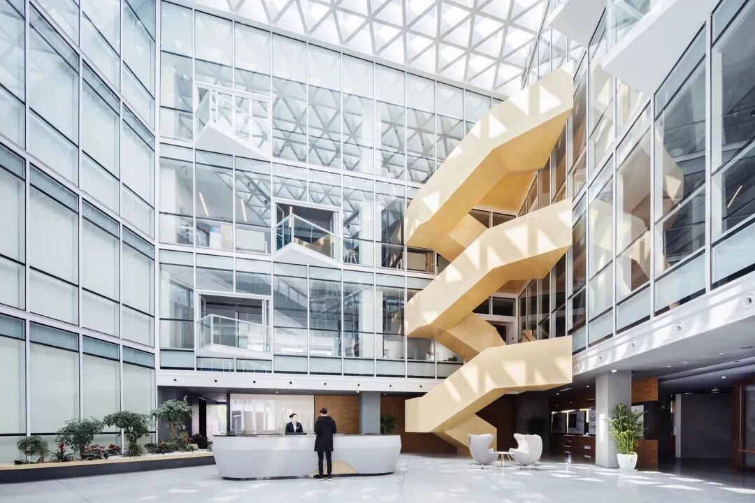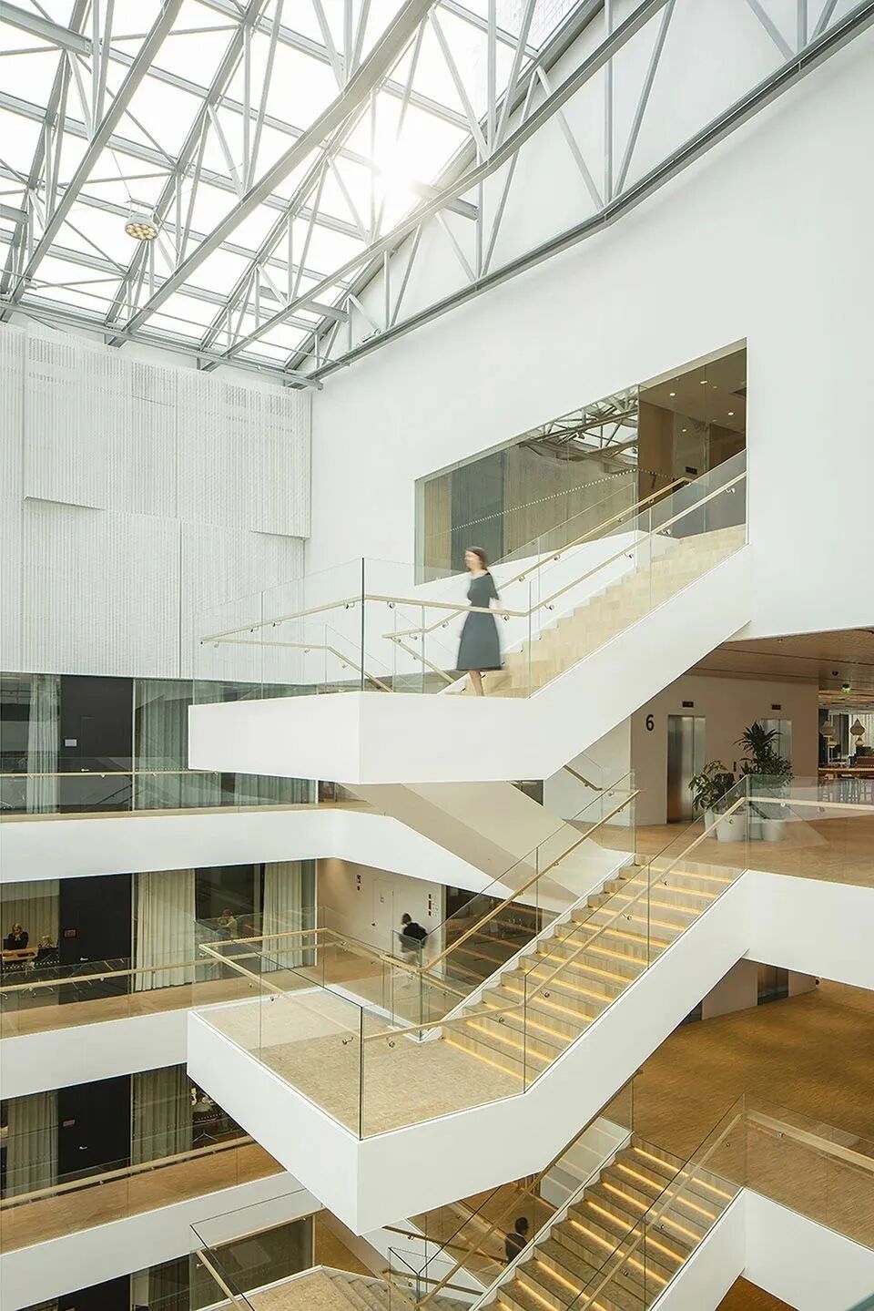 中庭空间的双跑或多跑梯,往往会用暖色材质或者钢制材料让其凸显于空间中,展现它的韵律感,节奏感。