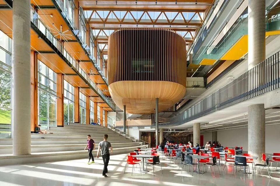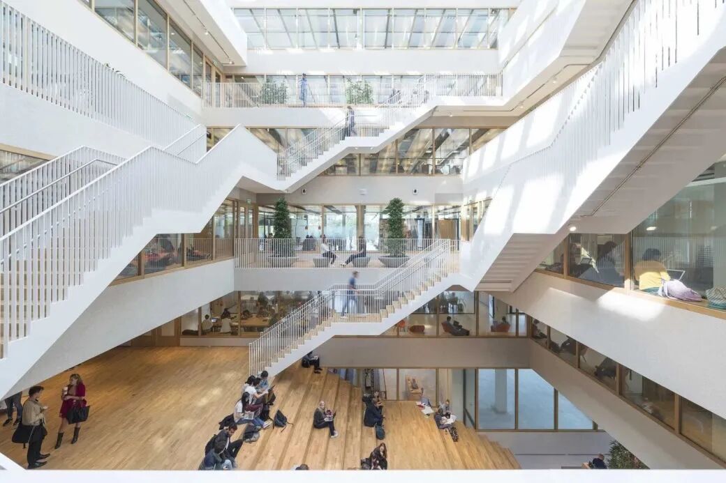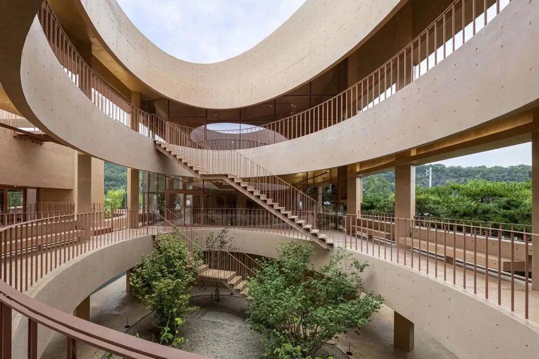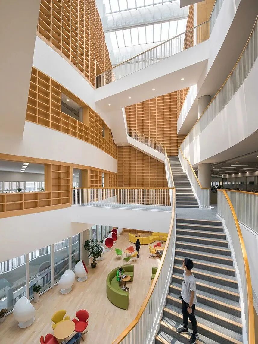 中庭空间的双跑或多跑梯,往往会用暖色材质或者钢制材料让其凸显于空间中,展现它的韵律感,节奏感。