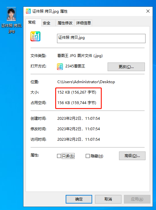 在存储位置找到我们保存的证件照,然后右键查看其属性,文件大小为152KB,(K是简称,与KB意思相同);文件符合小于200K的要求。