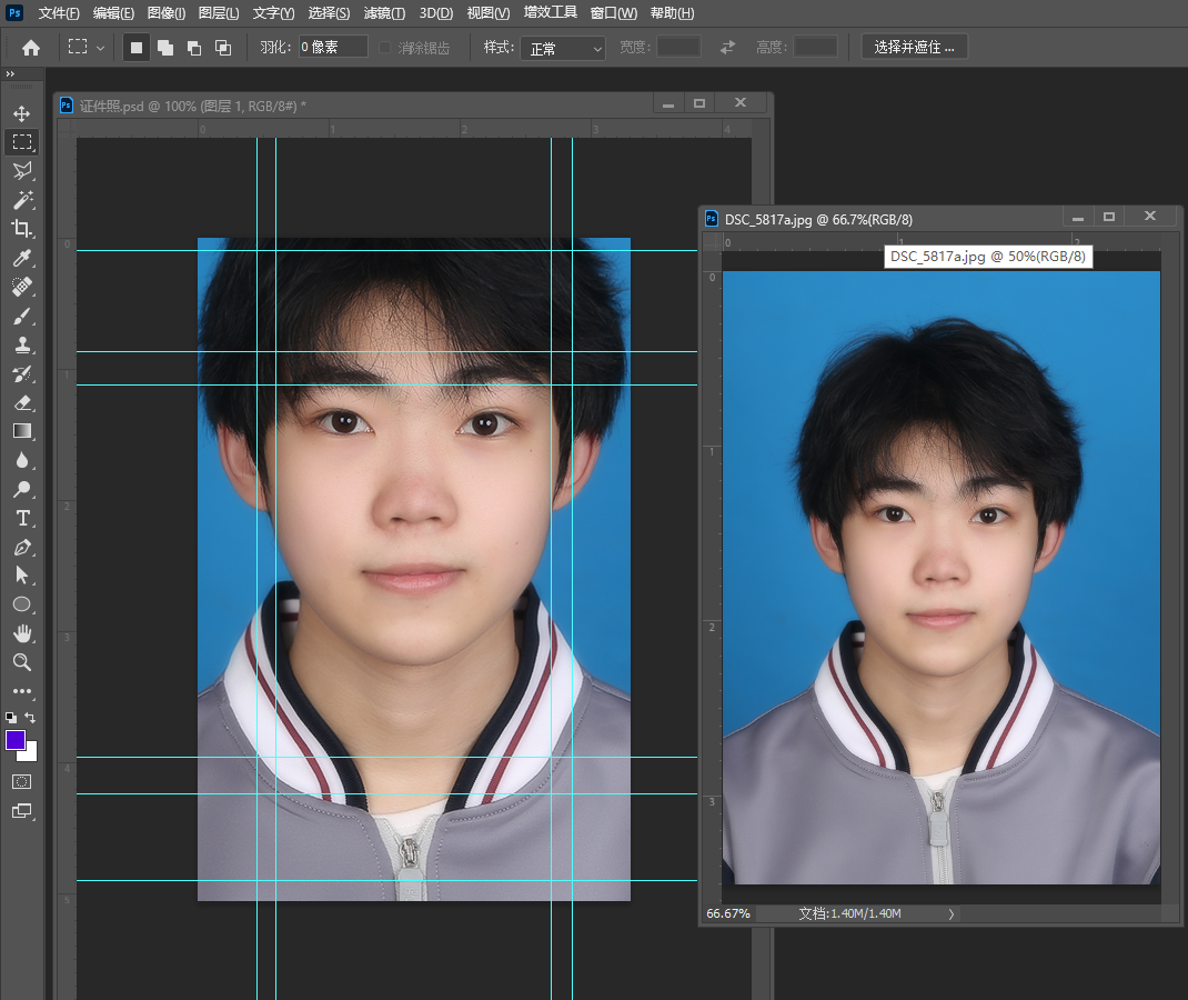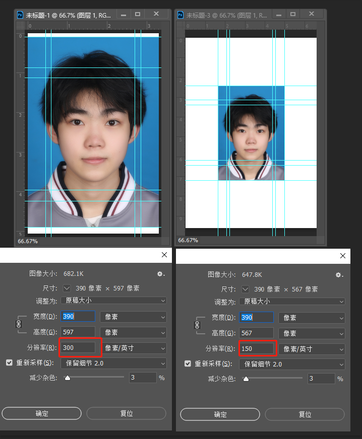 以上这5点,如果非专业人士,能全部理解的估计非常少吧,其实提出这些规格要求的人,并不专业,有故弄玄虚之感,第一条时,既然规定了像素,为何不直接规定好分辨率呢?如果不规定分辨率,那么只要分辨率小于等于300像素/英寸的照片都能满足要求,因为300像素/英寸时图像画布大小为50.55mm*33.02mm,正好能满足第五条要求,为了便于理解,我分别用分辨率300像素/英寸和150像素/英寸制作符合要求的证件照,下面两张照片左侧分辨率为300像素/英寸,右侧分辨率为150像素/英寸,这两张都能满足上述的要求,如果用的分辨率不同(常用的分辨率为300、72、150像素/英寸),这时照片就很难统一,分辨率为越小,四周的白边就越宽;还有第四条颜色模式,24位RGB真彩色,这么专业知识有多少人能明白的呢?本来RGB格式文件常规就是24位真彩色。