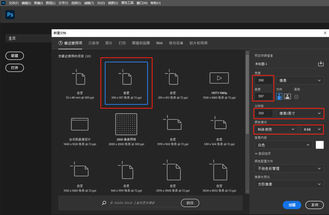 首先在PS软件中新建文件,选自定,主要参数如下: