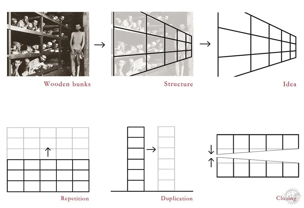 设计师将历史事件的发生地之间连线,构建出来的形状作为建筑的整体轮廓外形,建筑最终呈现一个折线挤出的复杂的“之字形”状态,又仿佛是一个正在承受剧烈痛苦而挣扎的人。