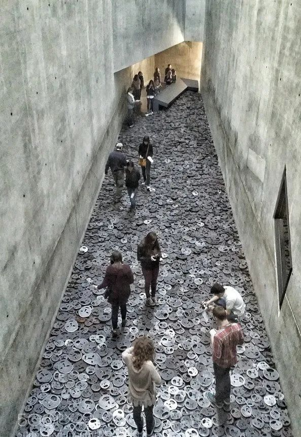 走廊上铺有海量铜制人脸。当人们穿过走廊,仿佛杀人机器运转般的声音和令人毛骨悚然的触感将人们的感受同大屠杀中的犹太人联系到一起。