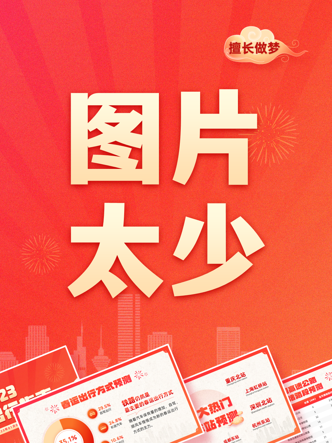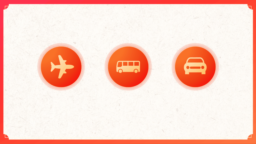 最后再加上烟花、祥云的装饰素材营造氛围。用飞机、巴士、高铁等图标素材“点题”春运,这页就搞定啦!