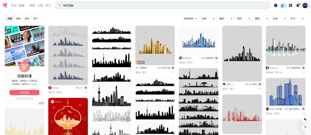 这里我拉了一个红色渐变背景,将城市剪影素材衬于底层填补空白。花瓣网搜索「城市剪影」,可以找到一堆这样的素材。