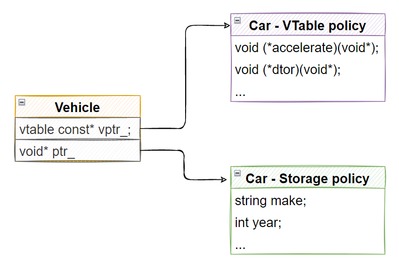 struct IVehicle {// Define the interface for vehicletemplate <class Base> struct Interface : Base {void accelerate() const {folly::poly_call<0>(*this);}};// Define how concrete types can fulfill that interface (in C++17):template <class T> using Members = folly::PolyMembers<&T::accelerate>;};using vehicle = folly::Poly<IVehicle>;struct Car {void accelerate() const {std::cout << "Car accelerate!" << std::endl;}};struct Trunk {void accelerate() const {std::cout << "Trunk accelerate!" << std::endl;}};void accel_func(vehicle const& v) {v.accelerate();}int main() {accel_func(Car{}); // Car accelerateaccel_func(Trunk{}); // Trunk acceleratereturn 0;}