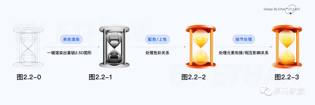 b. 下一步,在初步立体图形结构上进行上色调色,就像在画色彩一样,铺了大色调之后开始对物体的结构进行深入的刻画(如上图2.2-2),但在绘制这种2.5D单个元素时,在调整的前提先要做好配色,使用邻近色、对比色、冷暖色,同样的材质不同位置使用邻近色调整协调效果及质感;区别于结构的可使用对比色加强突出,这一步也是很多初步学习的设计师没考虑到,导致最终效果总是不如意;暗部或反光部位等可根据实际情况使用冷暖色协调整体的效果。